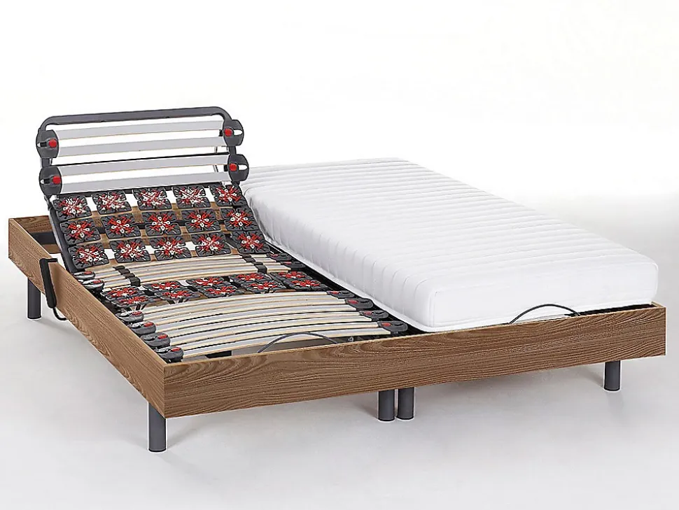 Faites le choix de l’ensemble électrique de relaxation PANDORA et son matelas accueil latex pour un sommeil de qualité.1 x Sommier de relaxation CISERANOCaractéristiques Couleur (nuance) : Naturel clair Matière (précision) : Mdf Taille (couchage) : 2 x 80 x 200 cm Taille : 2x80x200 cm Nombre de places : 2 places Avec pieds Technologie (sommier) : Lattes et plots Nombre de lattes : 28 lattes Option (sommier) : Barre d’arrêt Nombre de plots : 50 Plans de couchage : 5 Garantie : 5 ans Degré d’inclinaison maximum (tête) : 79 ° Degré d’inclinaison maximum (pieds) : 48 ° : Plots multidirectionnels en zone épaules et bassin pour un meilleur soutien : 8 double-lattes en zone lombaire pour allier solidité et souplesse : Lattes avec curseurs permettant de régler la fermeté : 2 télécommandesDimensions Longueur : 200 cm Hauteur : 35 cm Profondeur : 160 cm Hauteur des pieds : 20 cm2 x Matelas relaxation SAORICaractéristiques Technologie (âme) : Mousse Soutien : Ferme Densité (âme) : 20 kg/m³ Technologie matelas (accueil) : Latex Densité (accueil) : 60 kg/m³ Accueil : Moelleux Garnissage du matelas : Ouate Densité (garnissage) : 200 g/m2 Coutil (matière) : Coutil stretch Couleur (nuance) : Blanc Matière (précision) : 100 % Polyester Taille (couchage) : 80 x 200 cm Taille : 80×200 cm Nombre de places : 1 place Gamme : Good for Planet Produit : Mousse CertiPUR, Fibre OEKO-TEX, Fabriqué en France Compressé/roulé : NonDimensions Longueur : 200 cm Hauteur : 13 cm Profondeur : 80 cm Epaisseur matelas : 13 cm Hauteur de l’âme : 10 cm2 x Moteur OKIN vérin double avec télécommandeCaractéristiques Couleur (nuance) : Noir Matière (précision) : Plastique Gamme : Good for Planet Produit : Fabriqué en Europe Livré monté : Moteur puissant de 4500 NewtonDimensions Longueur : 71 cm Hauteur : 16.5 cm Profondeur : 12 cmLivraisonLors de la livraison, il est conseillé de vérifier que le bon nombre de colis a été livré.Colis1 x Sommier de relaxation CISERANOColis