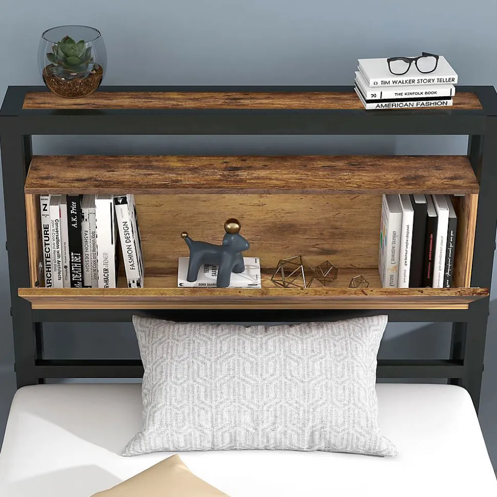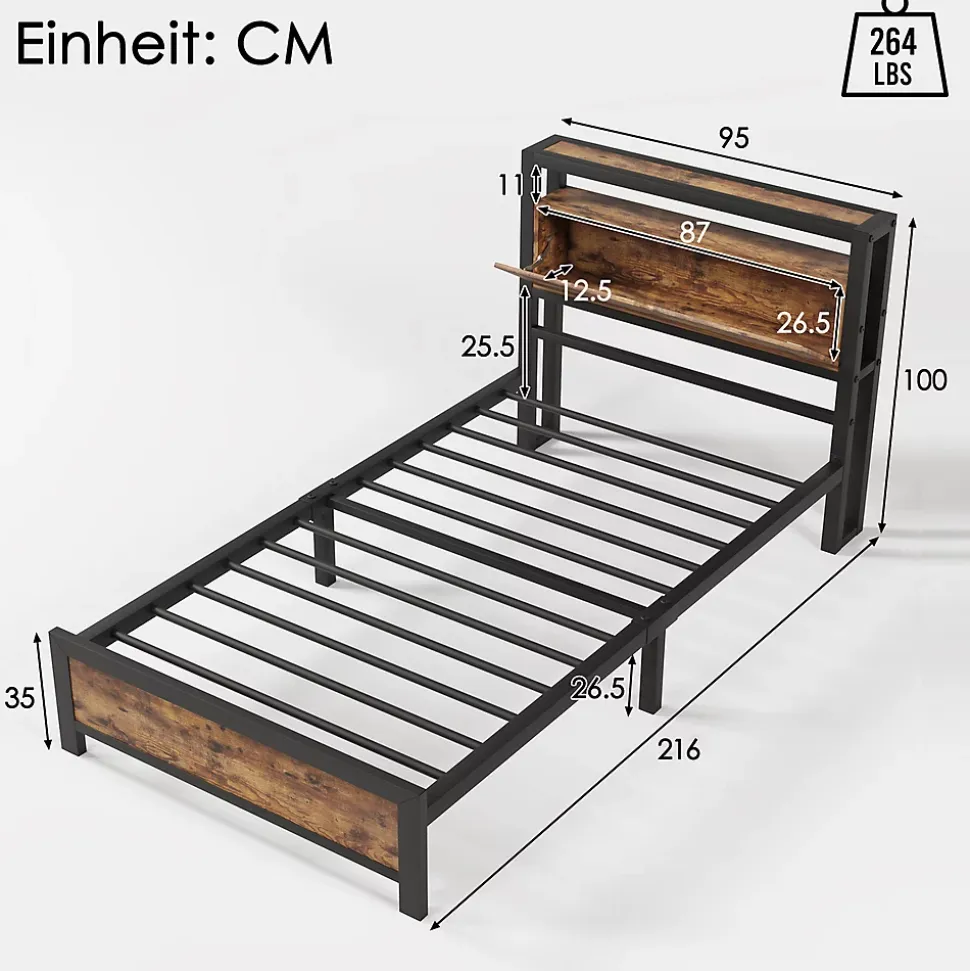 Lit métallique industriel 90×200 cm avec rangements (noir)Caractéristiques principalesDimensions : 216x100x95 cmMatériaux : Métal + bois MDFCharge max : 120 kgRangement : Tête de lit à étagères + espace sous lit (26,5 cm)Style : Industriel/rustiqueSommier : 12 lattes métalliquesLivraison1 colis : 112x43x18 cm (25 kg)Poids net : 24 kgPoints fortsTête de lit avec étagères pratiquesStructure métallique ultra-robusteDesign industriel élégant6 pieds stabilisateursMontage facile avec noticeInformations complémentairesMatelas 90×200 cm non inclusConvient pour enfants/adolescents/adultesOrigine : ChineNettoyage facile sous le litSolution fonctionnelle et stylée pour chambre