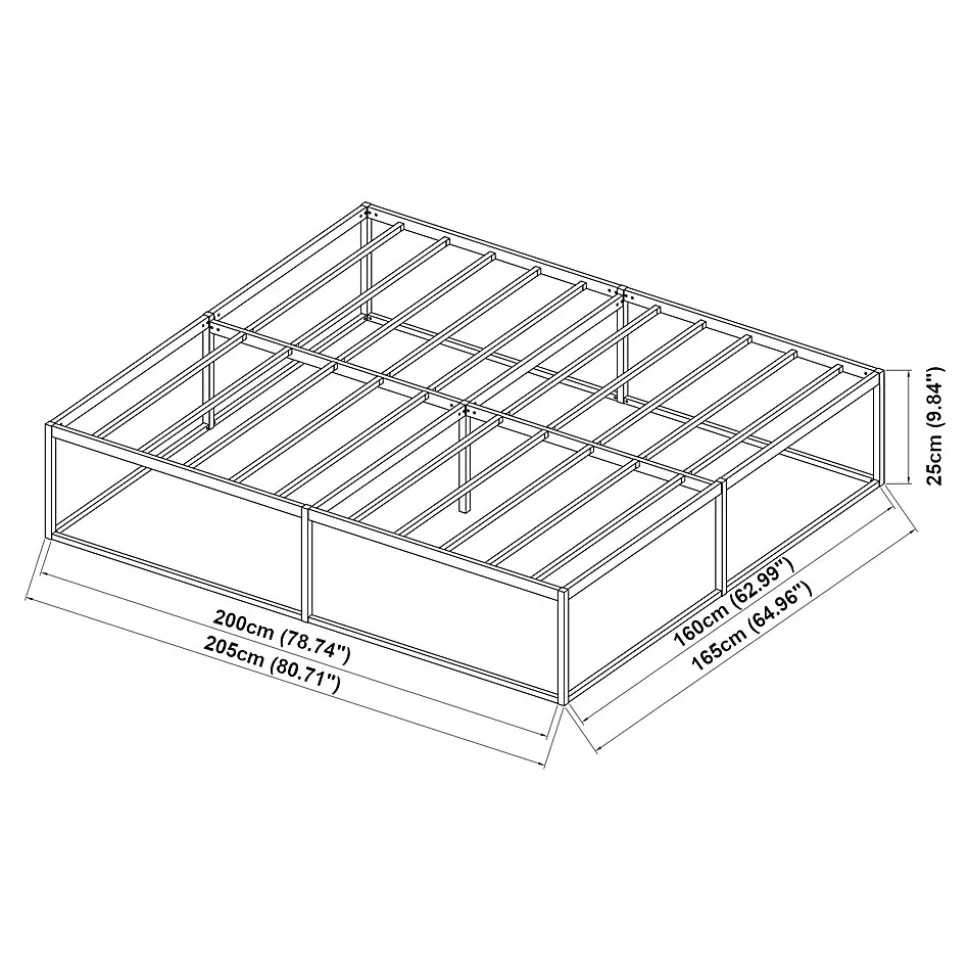 Lit en métalNotre lit moderne et intemporel, s’intègre aisément dans divers styles de décoration tout en apportant une touche d’élégance.Facile à monter gâce à des instructions claires, il vous garantit rapidement un espace de repos confortable. Sa structure métallique robuste offre une excellente stabilité et supporte une charge importante, tandis que les barres solides assurent un soutien optimal pour le matelas, favorisant un sommeil réparateur.Pratique, sa surface résistante aux rayures est facile à nettoyer, et son cadre surélevé permet une espace de rangement discret sous le lit. Transformez votre chambre en un havre de paix propice à la détente et aux doux rêves.Points forts :- lit double intemporel et élégant en métal- montage rapide et simple- surface résistante aux rayures et aux chocs pour une longue durée de vie- entretien facile- capacité de charge jusqu’à 300 kgMatière :acier laquéDimensions :- totales (longueur x largeur x hauteur) : 205 x 165 x 25 cm- surface de couchage (longueur x largeur) : 200 x 160 cmCouleur :noirContenu de la livraison :1 x lit en métalImportant :Le matelas, l’oreiller, la couverture et tous les autres objets de décoration ne sont pas compris dans la livraison !Remarque :Pour des raisons logistiques, le retrait sur place n’est pas possible.La livraison se fait jusqu’au trottoir ou à la porte d’entrée, sans montage.Produit de la marque :[en.casa]