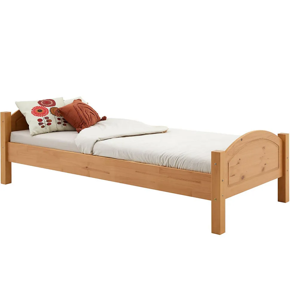 Le lit en pin Flims … apportera beaucoup de charme à votre chambre ou celle de vos enfants, grâce à son aspect naturel. Son design moderne et intemporel s’intègrera facilement avec le reste de votre mobilier. Réalisé en pin massif, il vous garantira une grande solidité et résistance. Sa tête et son pied de lit aux courbes arrondies, seront parfait pour amener un style élégant et authentique à votre intérieur. Description des matériaux : – Le cadre de lit est fabriqué en pin massif recouvert d’une lasure couleur hêtre. – La madrure du bois reste visible. Caractéristiques du produit : – Couchage 90 x 200 cm – Barre de renfort transversale – Hauteur de la tête de lit : 71 cm – Hauteur du pie de lit : 60 cm – Hauteur conseillée du matelas : 13 cm – Cadre de lit stable Livraison et montage – Contenu de la livraison: lit, sans décoration, notice de montage – Le produit est livré en pièces détachées – Assemblage facile grâce à la notice – Sans sommier et sans matelas – Photo non contractuelle Résumé: – Dimensions pieds: 64 x 64 mm – Hauteur cadre de lit: 17 cm – Hauteur pan de lit: 37 cm – Hauteur pied de lit: 60 cm – Hauteur tête de lit: 71 cm – Profondeur d’insertion: 12 cm – Convient uniquement avec: Sommier fagot à lattes – Sommier: vendu séparément – Surface: Lasuré, La madrure du bois reste visible – Dimensions monté: 71 x 98 x 211 cm (H x L x L) – Couchage: 90 x 200 cm – Couleur: Couleur hêtre – Matériel: Pin massif