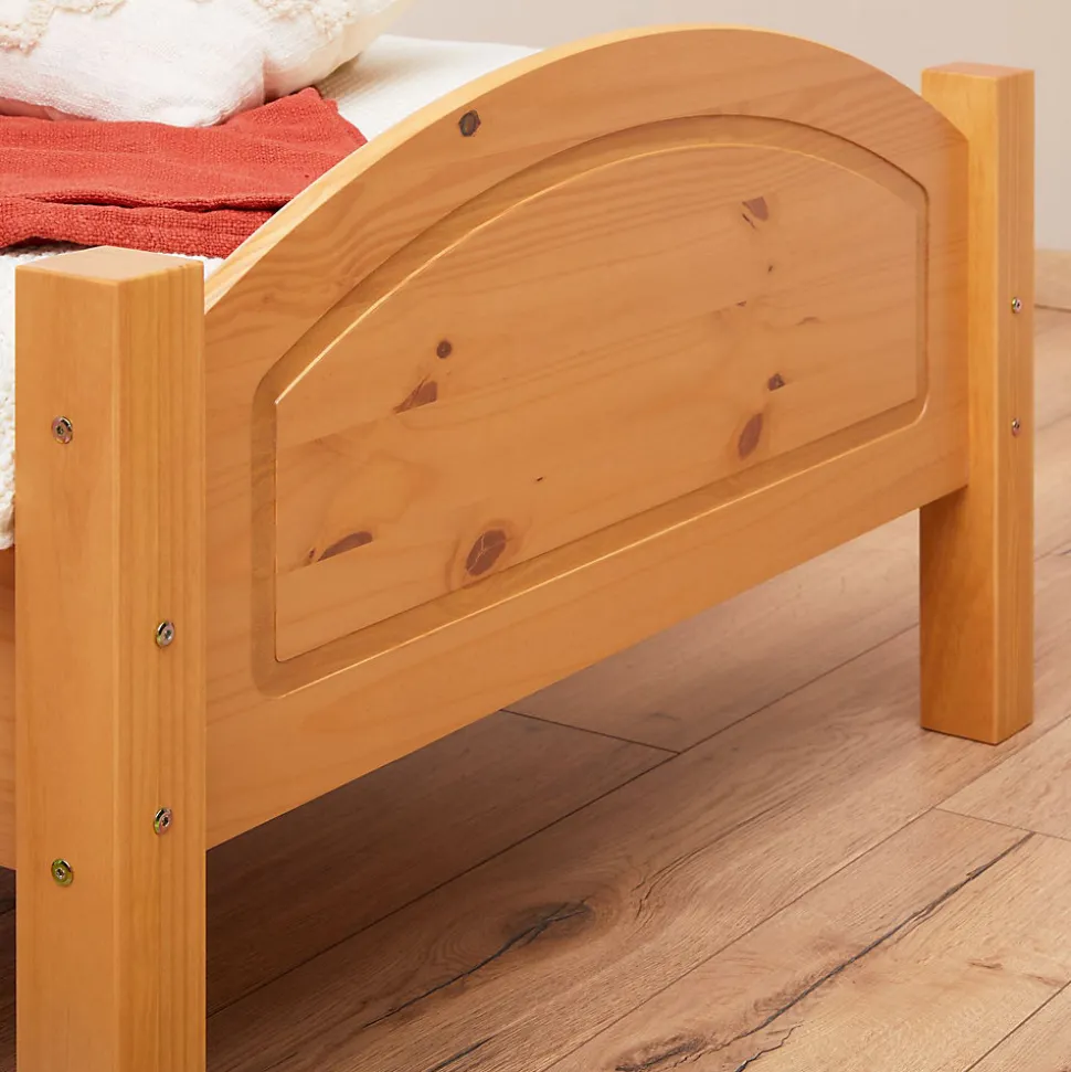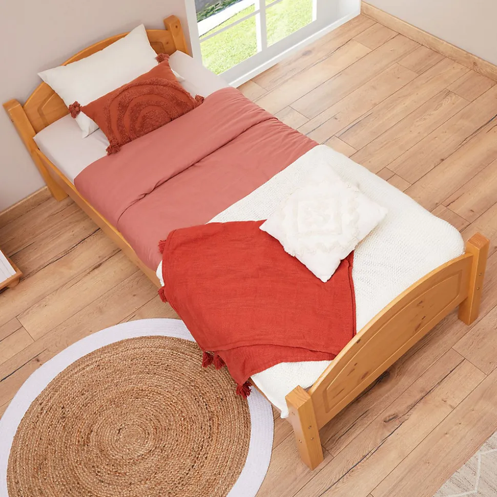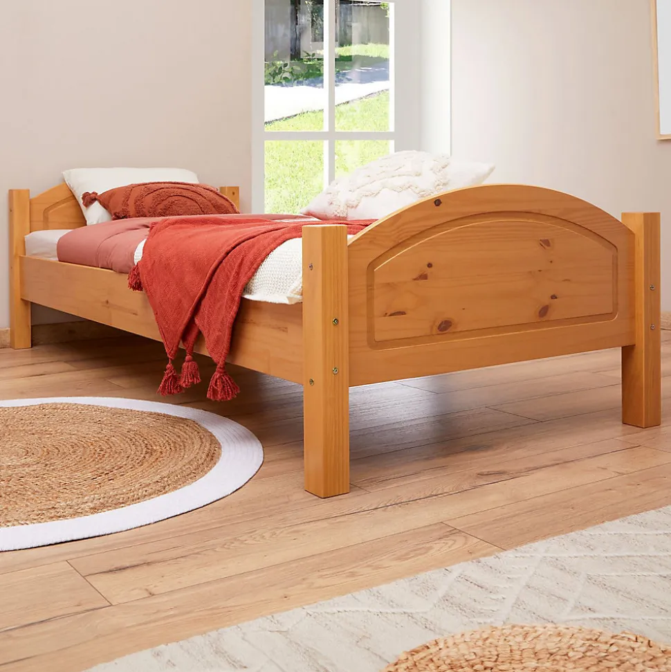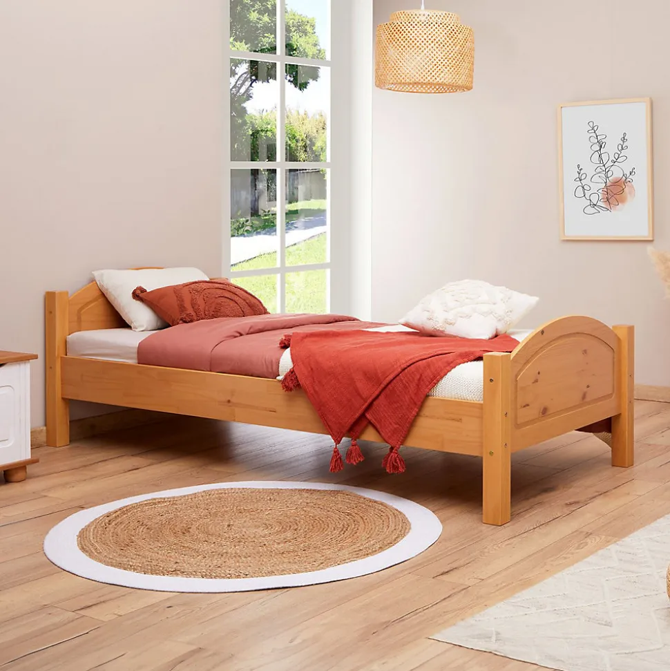 - Le cadre de lit est fabriqué en pin massif et est recouvert dune lasure à la finition couleur hêtre, où la madrure du bois reste visible