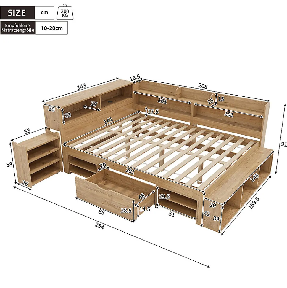 Caractéristiques du produitDimensions du produitLongueur assemblé (cm) : 254,00Largeur assemblé (cm) : 159,50Hauteur assemblé (cm) : 91,00Poids du produit (kg) : 100,90Dimensions du colisSous-article 1 : 92,71 * 41,61 * 27,99 cm 28,9 kgSous-article 2 : 113,49 * 38 * 20,5 cm 27,7 kgSous-article 3 : 154,48 * 46,2 * 15,09 cm 28 kgSous-article 4 : 197,99 * 31,29 * 16,48 cm 27,65 kgDescriptionsDétails du produitType Sommier à lattes Sommier à lattes inclusType Matelas sans matelasDétails Espaces de rangement Tiroirs de rangement, armoires de rangementRemarque Dimensions Toutes les dimensions sont approximativesCapacité de charge maximale 200 kgRevêtement contreplaquéMatelas compatible 140 x 200 cmPoids brut 100,9 kgLieu d’origine ChineCouleur principale : naturelMatériau principal : contreplaquéDimensions du lit : 140 cm x 200 cm