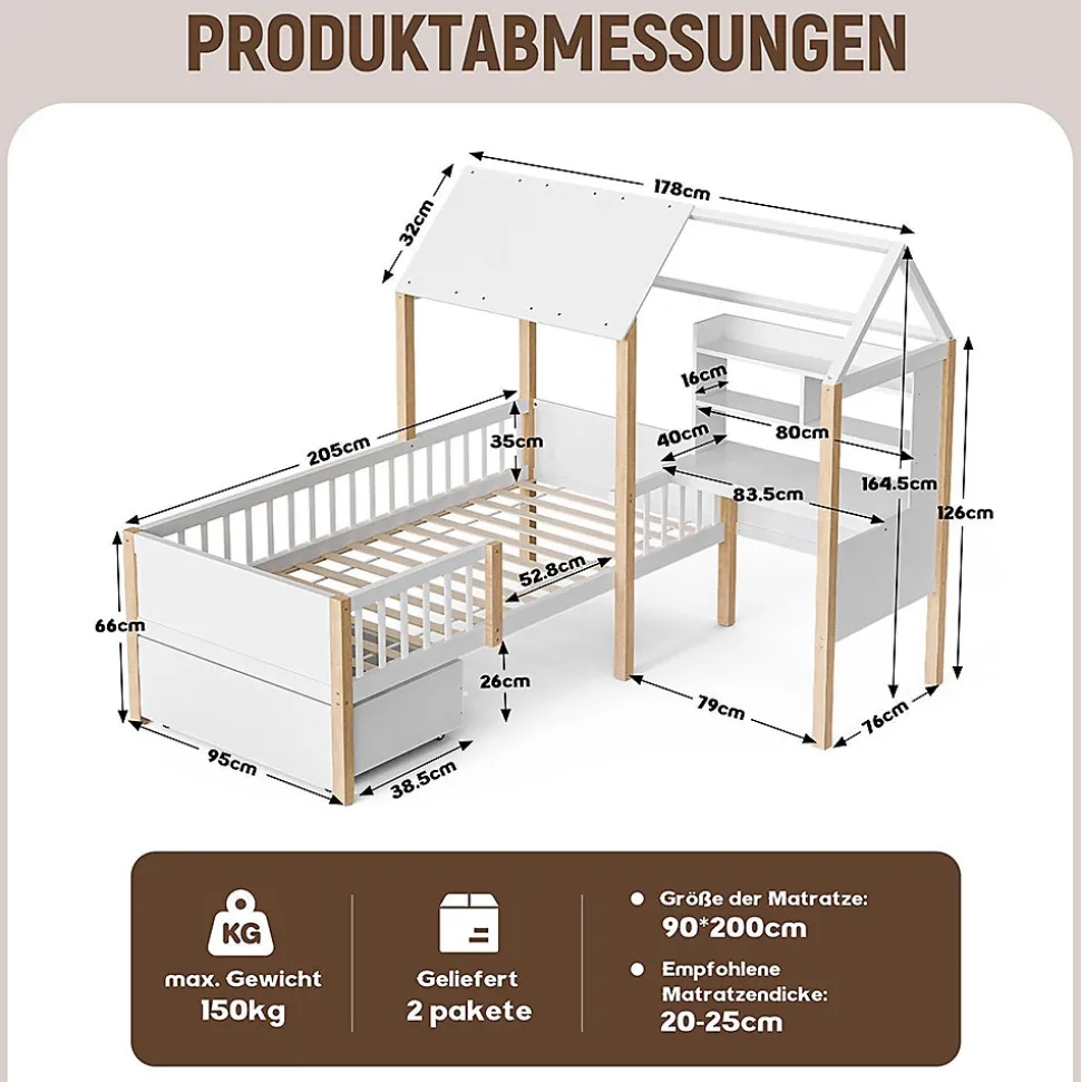 Caractéristiques du produitDimensions du produitLongueur assemblé (cm) : 205,00Largeur une fois assemblé (cm) : 178,00Hauteur une fois assemblé (cm) : 164,50Poids du produit (kg) : 50,00Dimensions du colisSous-article 1 : 97,5 * 47,5 * 18 cm 27 kgSous-article 2 : 199 * 33,5 * 15,5 cm 27 kgInformations sur le produitCapacité de poids 150 kgDimensions de la pièce 90*200 cmMatériau du cadre : boisÉpaisseur de matelas recommandée : 20-25 cmLongueur totale du cadre de lit : 205 cmLongueur totale du toit : 178 cmHauteur totale du cadre de lit : 164,5 cmLongueur totale du bureau : 83,5 cmPoids net/brut : 50/54 kgCouleur principale : blancMatériau principal : boisStyle du produit : côtier, mignon, luxueux, moderne du milieu du siècle, moderneCas d’utilisation : chambre à coucherTaille du lit : 90 cm * 200 cmType de lit : enfantsExigences relatives au sommier : sommier requisTeinte du bois : brun clair