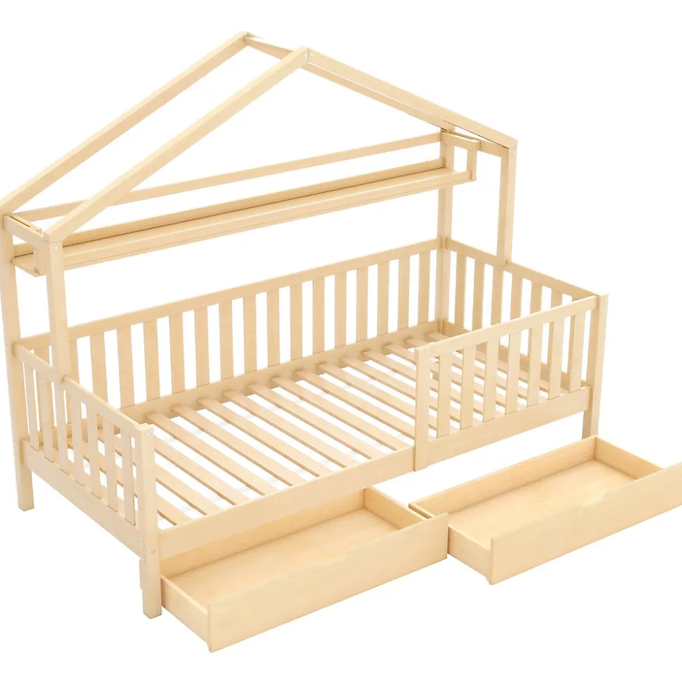 ▶ ▶ Détails ▶────────────────● Nom du produit : Kinderbett Hausbett avec tiroirs 90 x 200 cm● Dimensions totales : 204,5 x 95 x 166,5 cm (L x l x H)● Dimensions du tiroir : 95 x 66,5 x 23 cm● Couleur : Naturel● Matériau principal : Bois de pin + MDF● Sommier : Lattes en bois incluses● Capacité de charge : 150 kg● Matelas applicable : 90 x 200 cm (non inclus)● Nombre de colis : 2● Poids net : 39 kg● Pays d’origine : Chine● Dimensions des colis :▪ Colis 1 : 102,49 x 44,48 x 16,99 cm, 22,7 kg▪ Colis 2 : 197,99 x 26,97 x 19 cm, 26,95 kg► Remarques ►※ Le produit est livré en 2 colis, qui peuvent arriver séparément.※ Les dimensions peuvent varier légèrement (2-3 cm) en raison des mesures manuelles.※ La couleur peut différer légèrement de celle affichée sur les photos en raison des conditions d’éclairage.