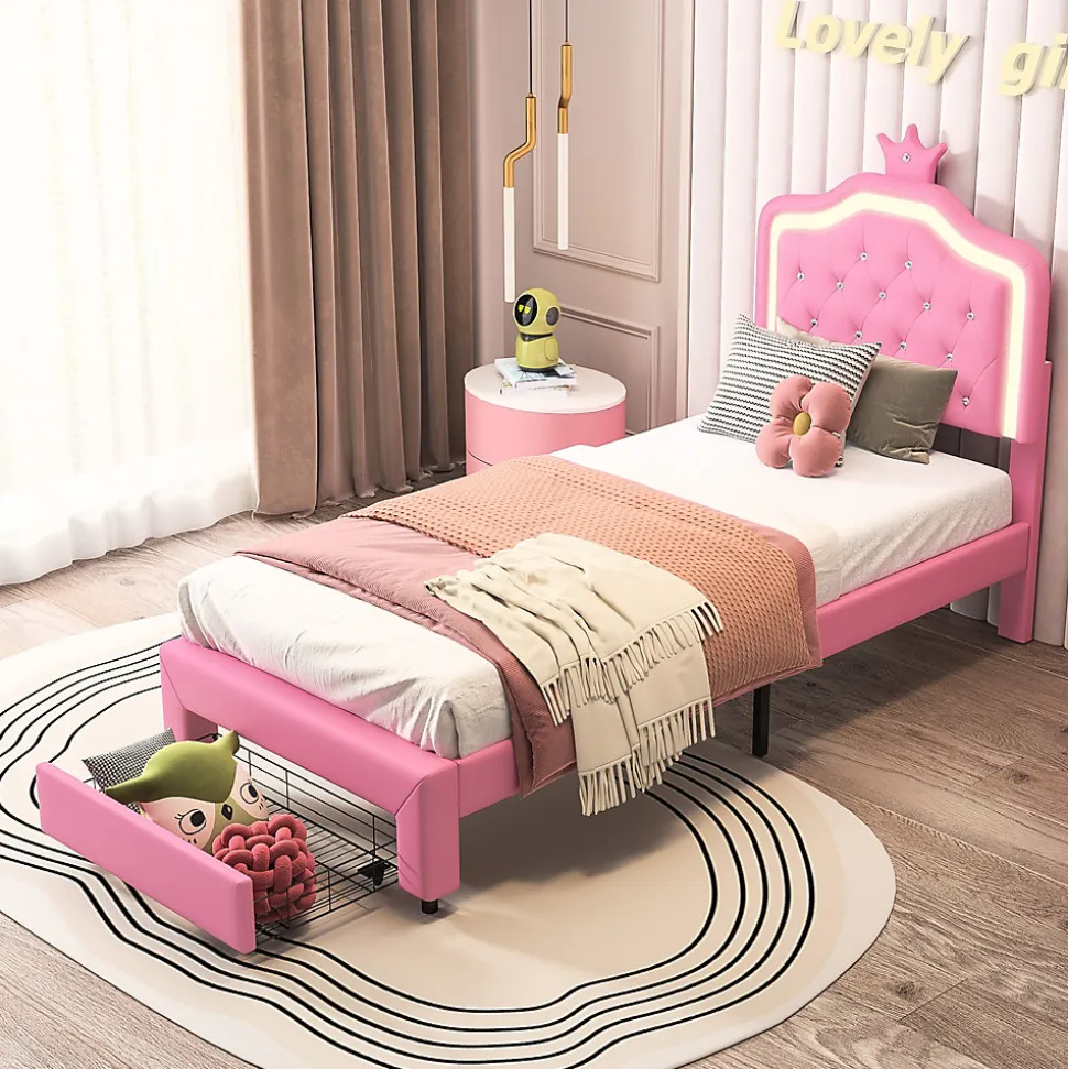 Description1. Style de design unique : la tête de lit est conçue avec des boutons en treillis et est agrémentée d’une petite couronne sur le dessus, pleine d’atmosphère de princesse ; la tête de lit réglable offre la hauteur la plus confortable pour les enfants, ce qui en fait un lit de rêve pour les filles.2. Matériau de haute qualité : il est fabriqué en matériau PU doux pour la peau, confortable, doux et imperméable, et facile à nettoyer. En même temps, les lattes en bois massif ajoutent de la stabilité au lit, assurant le confort. et la santé de l’enfant.3. Bande lumineuse LED intelligente : la tête de lit est équipée d’une bande lumineuse LED, qui prend en charge la télécommande par smartphone. La couleur et la luminosité de la lumière peuvent être ajustées à tout moment, ajoutant une atmosphère chaleureuse à la pièce.4. Conception pratique des tiroirs :tiroirs au bout du lit, qui sont pratiques pour ranger les jouets et les vêtements, ce qui permet de garder facilement la pièce bien rangée et ordonnée.5. Utilisation multifonctionnelle : ce n’est pas seulement un lit, mais aussi une œuvre d’art décorative dans la pièce, permettant aux enfants de profiter d’un environnement de sommeil sûr et confortable tout en augmentant le plaisir et la beauté de la pièce.Spécification:Dimensions : 209 x 91 x 113-118 cm (L x l x H)Matériel: PU + bois massif + métalAssemblage : à assembler soi-mêmeTiroirs : 1Charge maximale : 300 LBSMatelas applicable : 90 x200 cm (hors matelas)Détails de rangement :1 tiroirs de rangementHauteur de tête de lit réglable : Oui&Remarques&※ En raison de la mesure manuelle, un écart de 2 à 3 cm peut se produire.※ En raison de l’influence de la lumière du soleil et d’autres facteurs, il peut y avoir de légères différences de couleur.※ Ce produit sera expédié en 2 colis. Ils peuvent arriver à des moments différents. Veuillez patienter.※ Si vous avez des questions pendant l’installation, veuillez nous contacter dès que possible.
