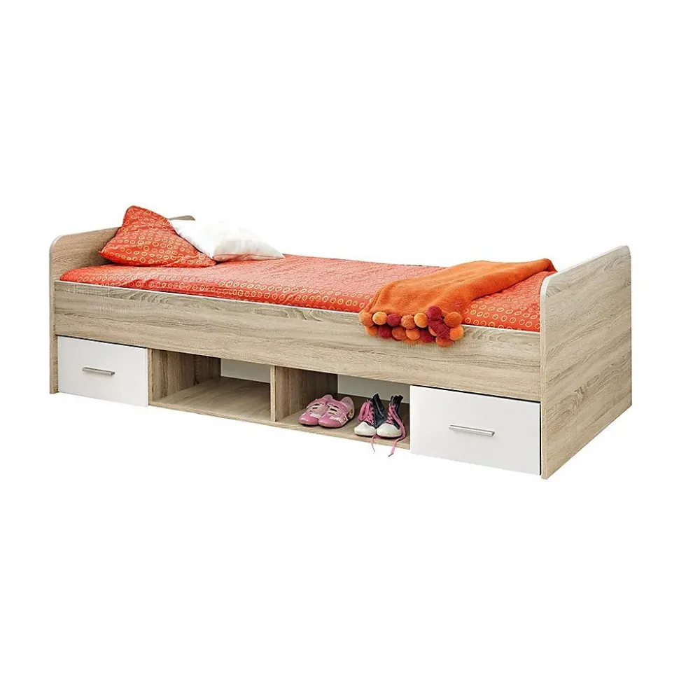 Lit enfant 90×200 collection DENVER avec 2 tiroirs et 2 niches – Coloris chêne et blanc.Ce lit pour enfant design de la collection DENVER fera de la chambre de votre enfant un véritable cocon, lui permettant de se détendre et de se reposer. Il apportera aussi de nombreux rangements grâce à ses 2 tiroirs et ses 2 niches- MODELE : Lit collection DENVER + sommier- COLORIS : Coloris chêne et façades tiroirs blanches.- STYLE : Moderne et design.- DIMENSIONS : * Lit + tête de lit : l96 x H64 x L204 cm (couchage 90×200 cm).- STRUCTURE : Panneaux de particules et MDF de première qualité.- CARACTÉRISTIQUES : Lit 90×200 avec 2 tiroirs et 2 niches. Sommier inclus MATELAS NON INCLUS (mais disponibles sur demande)Retrouvez également le reste de la collection DENVER directement sur notre boutique Castorama