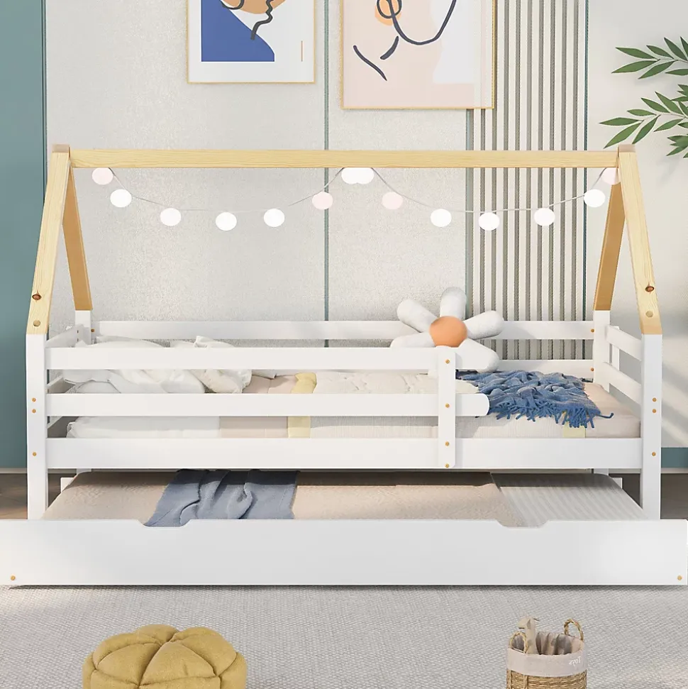 Description1. Le lit gigogne sous le sommier optimise l’utilisation de l’espace. Les invités qui passent la nuit ou les adultes accompagnateurs peuvent le déplier pour une utilisation temporaire. Même les ménages avec deux enfants peuvent répartir rationnellement l’espace de couchage tout en économisant de la place.2. Des capuchons sont fixés sur les écrous pour empêcher les enfants d’entrer accidentellement en contact avec les vis. Des détails optimisés renforcent la sécurité.3. Le cadre du lit présente une élégante finition blanche, tandis que le cadre supérieur conserve sa couleur bois naturel. Cette combinaison de couleurs classique confère à l’ensemble du lit un caractère chaleureux et distinctif.4. Le bois de pin massif garantit la solidité et la fiabilité du lit. Le renfort triangulaire à l’intérieur du cadre améliore la stabilité globale.5. Des barrières de sécurité multicouches sur les quatre côtés, associées à des panneaux de protection incurvés, protègent les enfants des chocs et des impacts. Les petits peuvent rouler et jouer sur le lit sans risque de chute.Caractéristiques techniquesDimensions hors tout : 209 x 97 x 130 cmCouleur : blanc + naturelMatériau du cadre : pinMatériau du sommier : boisPoids total : 39 kgHauteur depuis le sol : 20 cmTailles de matelas adaptées (matelas non inclus) : 90 x 200 cm et 90 x 190 cm (épaisseur du matelas ≤ 13 cm)Capacité de poids : 100 kgMéthode d’assemblage : à monter soi-mêmeNombre de colis : 2Pays d’origine : Chine