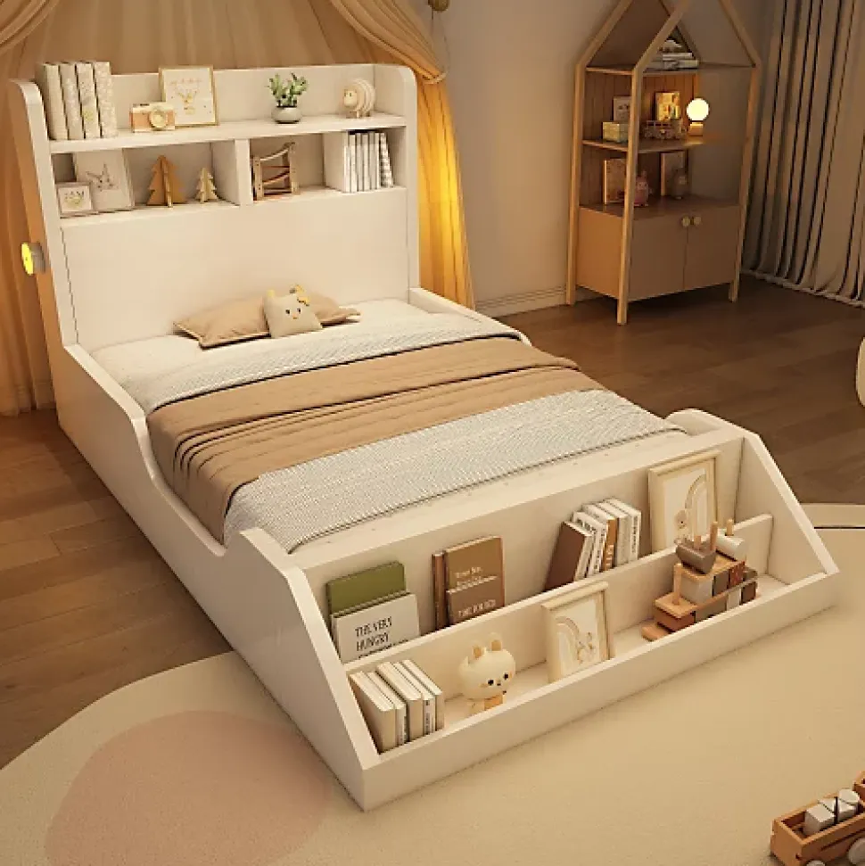 •【Veilleuses pratiques】Ce lit en bois est fourni avec deux veilleuses rondes dont la température de couleur est réglable grâce à une molette centrale. Magnétiques, elles sont dotées d’anneaux de suspension pour une installation et un retrait faciles. Rechargez-les pendant la journée et placez-les à côté du lit ou dans le couloir la nuit : un éclairage idéal pour créer un environnement propice à un sommeil paisible.•【Tête de lit élégante】La tête de lit est équipée de deux étagères pour exposer des cadres photo ou des objets décoratifs, comme des créations artisanales. Son design astucieux permet un gain de place et évite l’utilisation d’une table de chevet séparée : parfait pour les petits appartements.•【Étagère amovible】Une étagère au pied du lit, assortie à la couleur de la tête de lit, offre un espace de rangement pratique pour les livres et les jouets des enfants.•【Bois de qualité supérieure】Ce lit est fabriqué en bois de qualité supérieure, garantissant une structure robuste et durable. Le sommier à lattes encastrées empêche efficacement le matelas de glisser, assurant ainsi un confort optimal pendant le sommeil. Les cache-trous ronds blancs fournis dissimulent parfaitement les trous de fixation.•【Facile à assembler】Des instructions détaillées et des pièces complètes sont disponibles pour vous aider à réaliser l’assemblage rapidement.