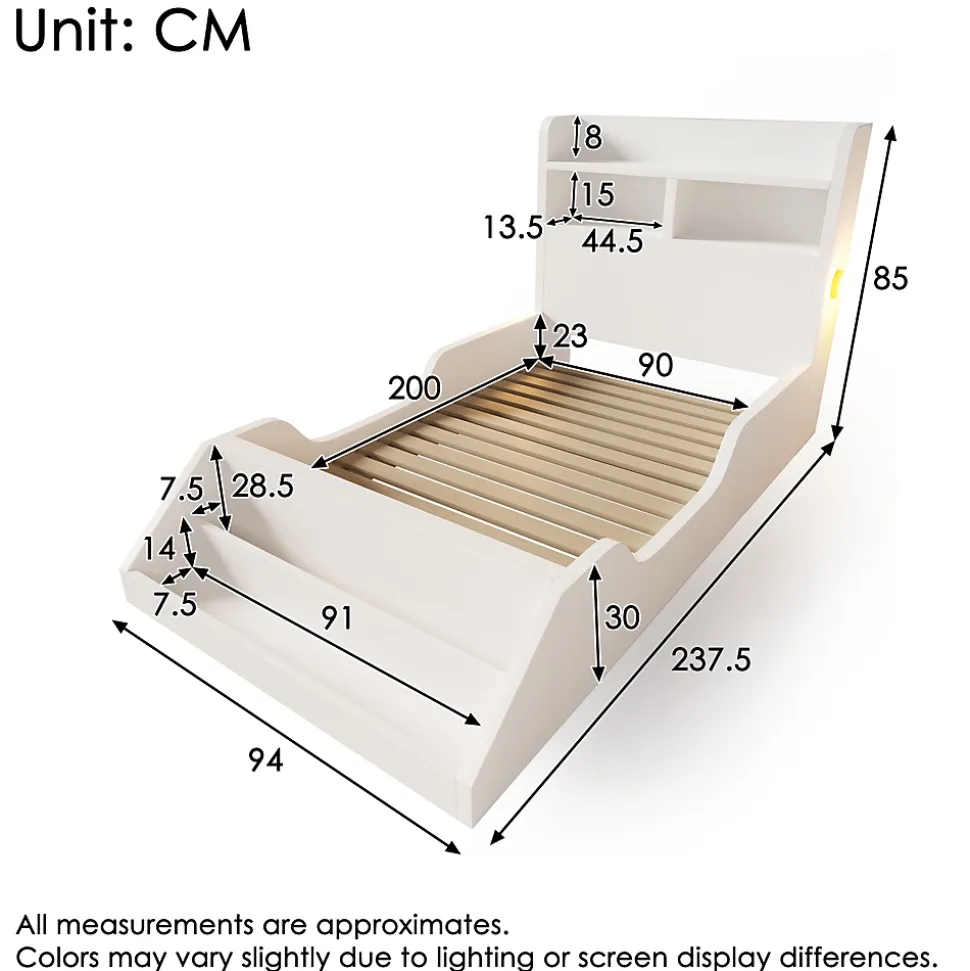 Spécifications● Couleurs du produit : Blanc● Dimension du produit : 237.5x94x85cm● Matériau du produit : panneaux de particules + MDF● Poids du produit : 39.6kg● Capacité de charge : 150kg● Épaisseur recommandée du matelas : 20cm (Matelas non inclus)● Montage requis : Oui● Nombre de colis : 2Attention● Ce produit est divisé en 2 colis pour la livraison. Il se peut qu’ils n’arrivent pas en même temps. Merci d’attendre patiemment.● La livraison comprend un cadre de lit, un sommier à lattes. Le matelas n’est pas compris dans la livraison.● Si vous avez des questions pendant l’installation, veuillez nous contacter dès que possible.