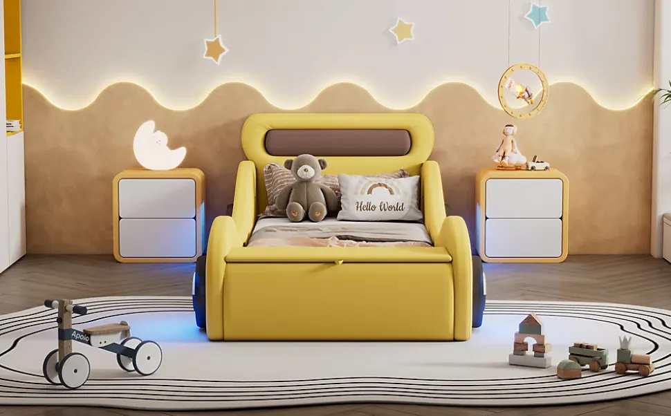 Description :Ce lit en forme de voiture est un rêve devenu réalité pour les enfants. Avec ses roues lumineuses colorées, il est non seulement fun mais aussi pratique, offrant un espace de rangement à l’extrémité du lit. Fabriqué avec des matériaux de qualité, ce lit combine style et sécurité, idéal pour les enfants qui aiment les voitures. Parfait pour les chambres d’enfants, il ajoutera de la couleur et de la magie à leur chambre.Caractéristiques :Matériaux : PU + MDFDimensions du lit : 90 x 200 cmHauteur totale : 82 cmPoids maximal supporté : 150 kgNombre de colis : 3Montage nécessaire : OuiDimensions recommandées pour le matelas : 10-15 cm (non inclus)Détails supplémentaires :Design amusant : La forme de voiture avec des roues lumineuses ajoute un côté ludique et attrayant pour les enfants.Rangement pratique : Le compartiment de rangement sous le lit permet de garder la chambre bien ordonnée.Sécurité : Le lit est entouré d’un coussin doux pour éviter que l’enfant tombe pendant son sommeil.Installation facile : L’assemblage est facile grâce aux instructions détaillées.Livraison en 3 colis : Expédié en 3 colis séparés. Veuillez patienter ou contacter notre service client pour toute question.