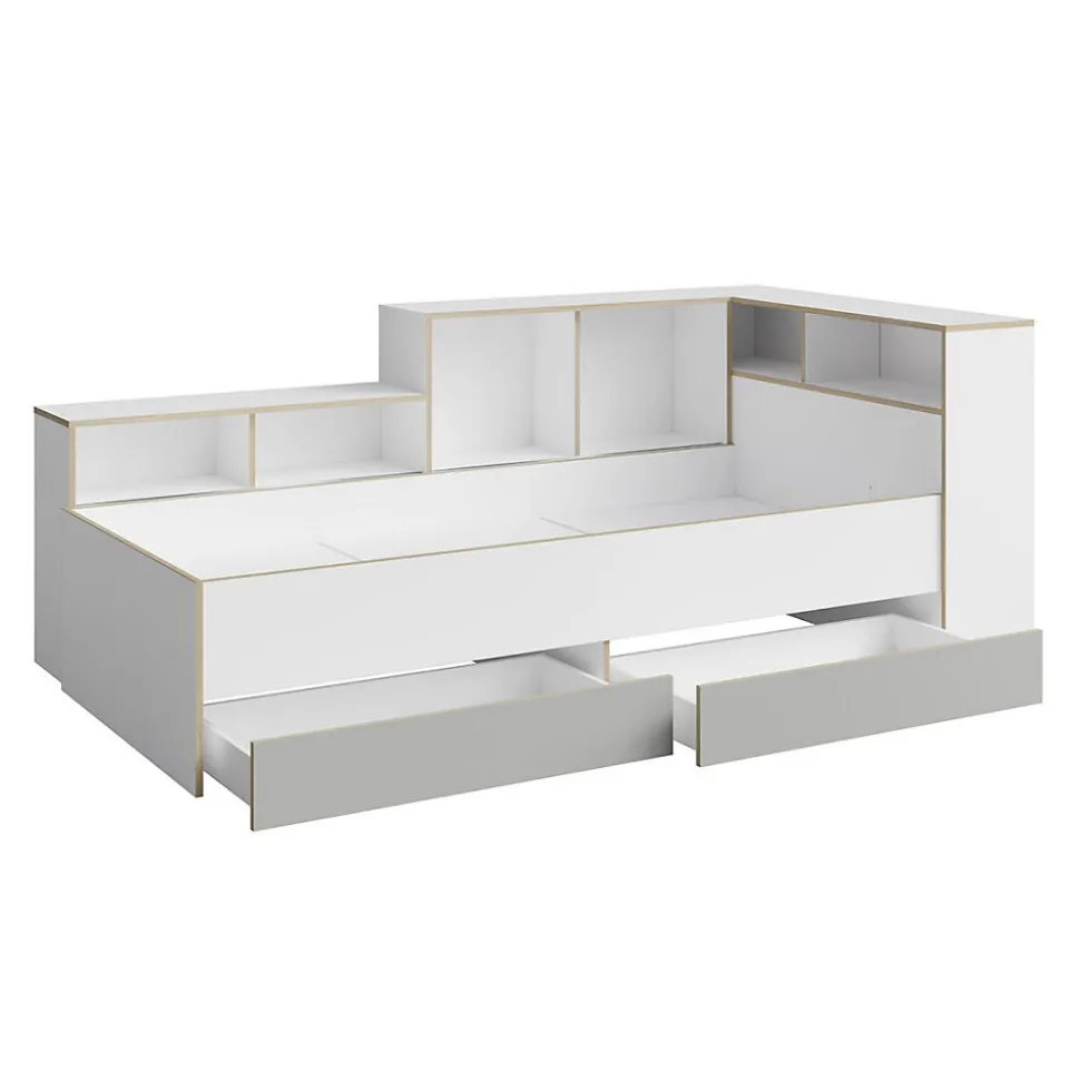 Lit enfant ELYO 90×200 cm avec rangements – Coloris gris, blanc et chêne clairOptimisez l’espace de la chambre de votre enfant avec le lit enfant ELYO. Plus qu’un simple couchage, ce modèle astucieux combine confort et nombreux rangements pour un espace organisé et fonctionnel. Son design moderne, avec une association de gris et blanc rehaussée par une finition effet chêne clair, apporte une touche chaleureuse et élégante.Un lit avec de multiples rangementsCe lit enfant de 90×200 cm est équipé de :2 tiroirs spacieux parfaits pour le linge de lit, les jouets ou vêtements.Des niches ouvertes pratiques pour garder les livres ou objets préférés à portée de main.Des niches fermées avec portes battantes pour un rangement discret.Des étagères intégrées idéales pour une organisation optimale.Un véritable meuble multifonction qui permet de gagner de la place tout en offrant un couchage confortable.Qualité et praticitéFabriqué en panneaux de particules et MDF de première qualité, le lit ELYO assure robustesse et longévité. Sa structure stable et bien pensée facilite le quotidien des enfants comme des parents. Matelas et sommier non inclus, sommier fourni.Les atouts du lit enfant ELYOLit 90×200 cm avec nombreux rangements2 tiroirs, niches ouvertes et fermées, étagères intégréesDesign moderne gris, blanc et effet chêne clairFabrication européenne robuste et de qualitéParfait pour optimiser les petits espacesLa collection ELYO : des meubles pratiques pour chambre enfantAssociez ce lit avec les autres meubles de la collection ELYO pour créer une chambre enfant harmonieuse, pratique et évolutive. Découvrez également nos modèles dans la catégorie Lit.