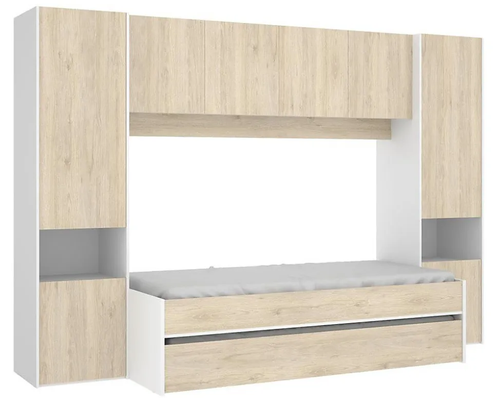 Lit gigogne enfant décor blanc/chêne structure en panneaux de particules mélaminéAvec tiroir utilisable en 2ème couchage ou rangementEnvironnement avec multiples rangementsCouchage 90×190 cmLivré sans matelas, sommier inclus.Dimensions total: Longueur 302 x Hauteur 203 x Profondeur 50-97 cmDimensions totales du lit : Longueur 92 x Profondeur 198 x Hauteur 50cmDimensions totales de l’environnement : Longueur 303 x Profondeur 50 x Hauteur 203 cmDimensions du tiroir lit : Longueur 192 x Profondeur 90 x Hauteur 26 cmCouchage : 90×190 cmMatière : panneaux de particule Coloris : blanc / chênePoids : 212 kg