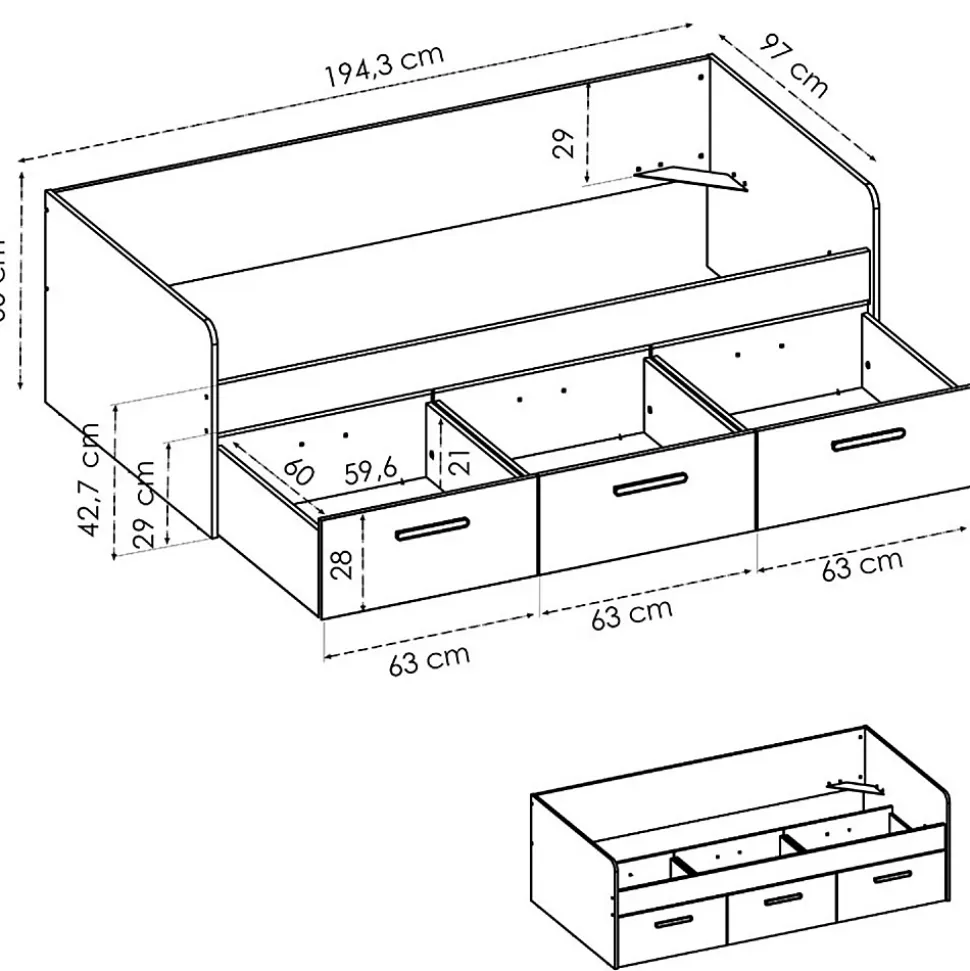 Ce lit est préparé pour un matelas de 90 x 190 cm. Sa structure est très résistante grâce à sa fabrication en panneaux de particules mélaminés de bonne qualité. Dispose de 3 tiroirs avec glissières métalliques et 3 poignées. Sommier + matelas non inclus.Caractéristiques :Dimensions : – Lit : Longueur 194.3 x Profondeur 97 x Hauteur 60 cm- Tiroir : Longueur 59.6 x Profondeur 60 x Hauteur 21 cmMatière : Panneaux de particules mélaminés Couleur : BlancPoids : 51 kg