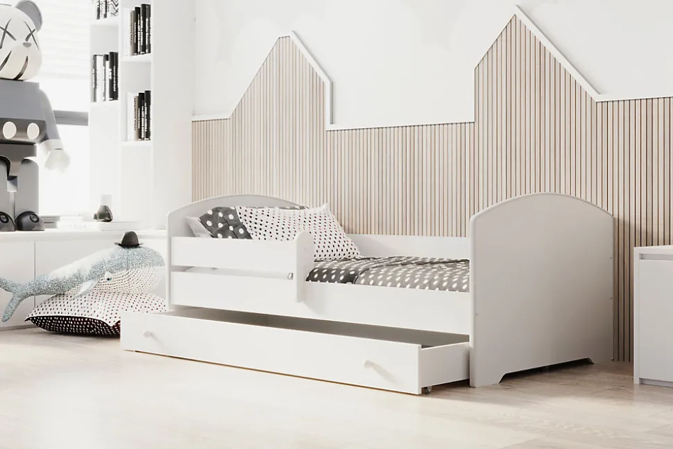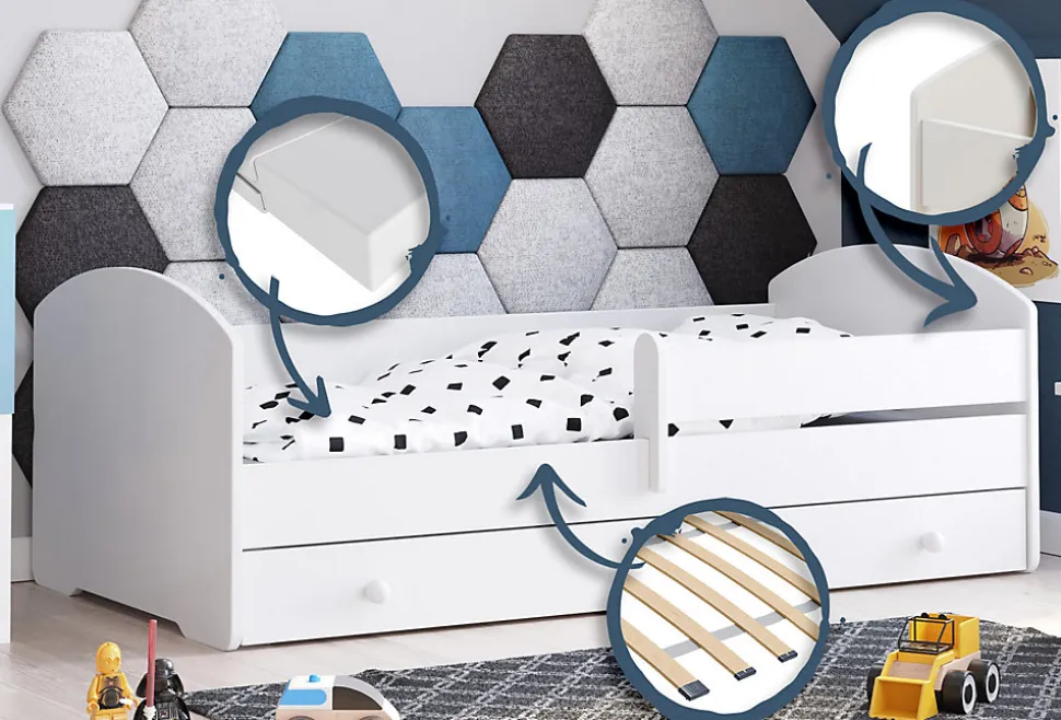 Le modèle LUK est une combinaison d’une construction solide et de solutions pratiques. Équipé d’une barrière de protection mobile, il garantit la sécurité pendant le sommeil, et le lot comprend également un matelas confortable ainsi qu’un tiroir spacieux qui facilite le rangement de la literie, des jouets ou d’autres accessoires. Les bords arrondis et les bords protégés par du PVC minimisent le risque de blessures, tandis que le cadre robuste avec le système FLEX assure un bon amortissement et un confort d’utilisation. Fabriqué à partir de matières premières certifiées, le lit est durable, stable et sûr pour les enfants de tous âges.