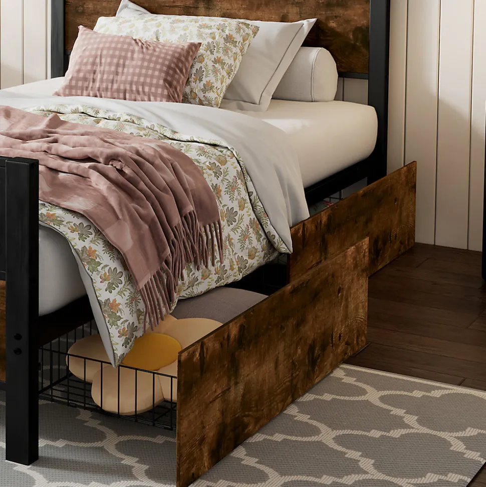Lit Enfant en Métal 90x200cm, avec Tiroirs, Noir et Noyer, Style VintageCe lit en métal avec finition noyer offre un mélange de style industriel et vintage. Équipé de deux tiroirs montés sur roulettes, il fournit un rangement pratique tout en gardant un design épuré. Sa structure métallique robuste assure une excellente stabilité.Points forts :Structure robuste en métal et MDFTiroirs sur roulettes intégrésSommier en métal stableFinition bois vintageIdée cadeau originaleDétails techniques :Dimensions totales : 208 x 91,5 x 116 cmMatelas recommandé : 90 x 200 cm (épaisseur ≤ 15 cm, non inclus)Capacité de charge : 150 kgPoids net : 26 kgMatériau cadre : Métal + MDFMatériau des lattes : MétalAssemblage requis : Oui (1 colis)Origine : ChineRemarque : Les couleurs peuvent varier légèrement en fonction de la lumière.