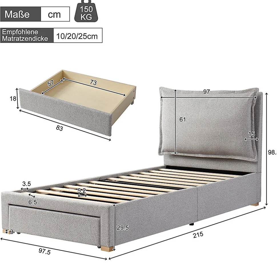 Caractéristiques du produitDimensions du produitLongueur assemblé (cm) : 215,00Largeur assemblé (cm) : 97,50Hauteur assemblé (cm) : 98,50Poids du produit (kg) : 33,40Dimensions de l’emballageSous-article 1 : 101,19 * 31,98 * 27,79 cm 20,5 kgSous-article 2 : 100,08 * 73,08 * 11,1 cm 17,2 kgInformations sur le produitCouleur principale : grisMatériau principal : chenilleType de sommier Un sommier à lattes est inclus dans la livraisonType de matelas Sans matelasDétails Espaces de rangement TiroirRemarque Dimensions Toutes les dimensions sont approximativesCapacité de charge maximale 150 kgRevêtement ChenilleÉtat à la livraison Démonté, 2 colis Ce produit est livré en 2 colis. Il est possible qu’ils n’arrivent pas en même temps. Veuillez patienter.