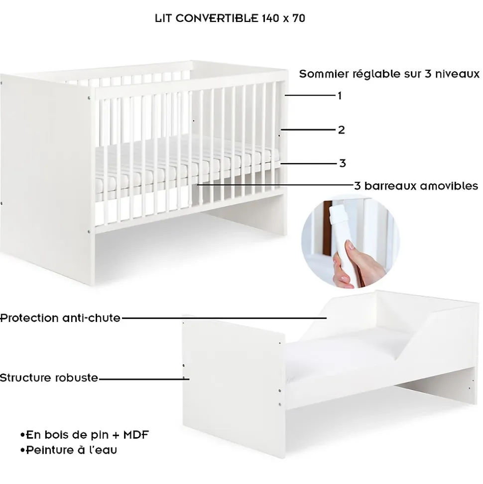 DALIA Lit évolutif bébé convertible en lit enfant Dès la naissance. Modèle avec ou sans tiroir gris. CARACTÉRISTIQUES : Pratique, ce lit évolutif convertible grandit en même temps que votre enfant. Son sommier réglable sur 3 positions permet d’adapter sa hauteur à la croissance de l’enfant. Avec ses 3 barreaux amovibles, l’enfant peut se lever et se coucher seul, premiers pas vers l’autonomie. Lorsque l’enfant est prêt à quitter son petit nid, c’est le moment de moduler son lit. Les côtés à barreaux laissent la place à 2 côtés avec des pans de sécurité. Les parois latérales se rabaissent. Le lit > est ainsi prêt pour l’accompagner pendant de nombreuses années. Ce lit est disponible avec ou sans tiroir gris. Matériau : bois de pin + MDF. Fabriqué en Union Européenne. À monter. Matelas non inclus. DIMENSIONS ET POIDS : Dimensions extérieures du lit : L 145 cm x l 76 cm x H 85 cm. Dimensions intérieures du lit : L 140 cm x l 70 cm. Dimensions du tiroir : L 139 cm x l 74 cm x H 17 cm. À NOTER : pas de livraison en Corse ou sur les îles.