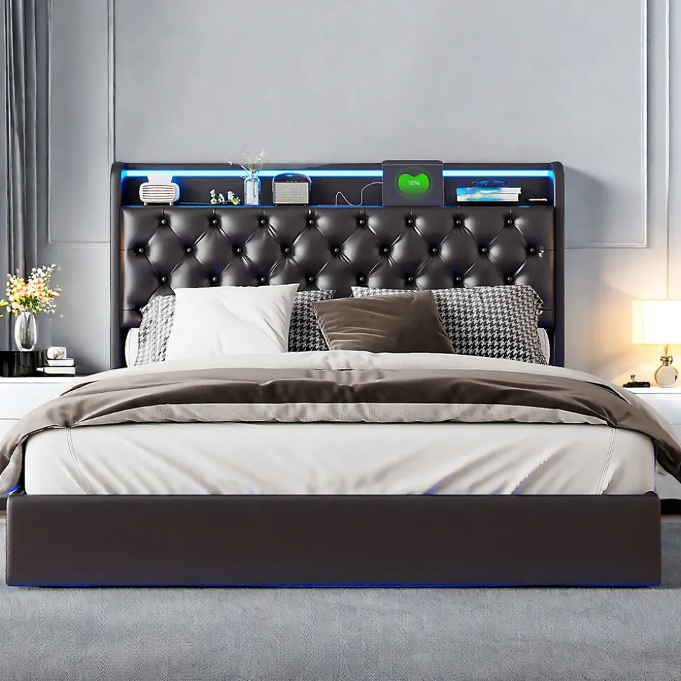 Design Flottant et Élégant Structure moderne avec effet suspendu unique, combinée à des bandes LED intégrées sur le corps et la tête de lit, créant une ambiance lumineuse personnalisable et contemporaine dans votre chambre. Tête de Lit Rembourrée avec Rangement Compartiments pratiques intégrés dans la tête de lit pour garder vos livres, télécommandes, lunettes ou autres objets essentiels à portée de main, tout en offrant un appui confortable pour sasseoir ou lire. Éclairage LED Intégré Haut de Gamme Bande lumineuse sur la tête et le corps du lit, idéale pour créer différentes ambiances (lecture, détente, décoration), avec un rendu lumineux élégant qui souligne le design moderne du lit. Prise Européenne Intégrée Deux ports de charge EU directement sur la tête de lit pour recharger smartphones, tablettes et autres appareils électroniques sans multiprises, combinant praticité et modernité. Surface de Couchage Confortable 160×200cm Lit double standard offrant confort optimal pour deux personnes, revêtement en PU synthétique de haute qualité facile à nettoyer, durable et élégant, idéal pour un intérieur contemporain et fonctionnel. Détails : Dimensions hors tout : 208 x 165 x 106 cmCompatible avec les matelas : 160x 200 cm (matelas non inclus) Pour garantir une expédition en toute sécurité, ce lit sera expédié par lots et pourrait ne pas arriver simultanément. Merci de votre patience.