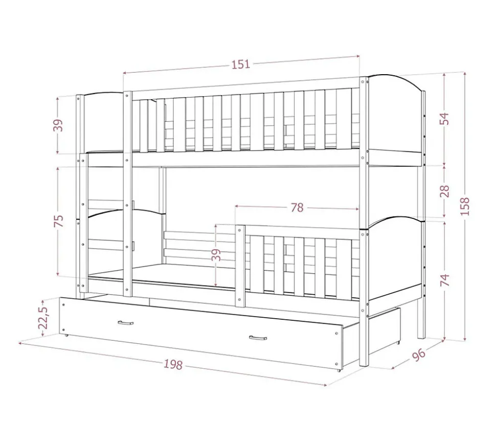 - Dimensions totales du lit simple THOMAS (L x H x P) : 204 x 30 x 104 cm