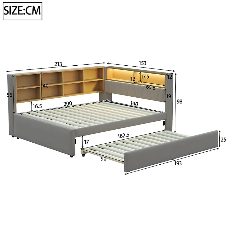 ▶ ▶ Détails ▶────────────────● Nom du produit : Lit gigogne● Dimensions totales : 213 × 153 × 98 cm● Dimensions du lit principal : 140 × 200 cm● Dimensions du lit gigogne : 90 × 190 cm● Poids total du produit : 64,7 kg● Poids total des colis : 70,7 kg● Nombre de colis : 3● Capacité de charge : 300 kg● Nombre de lattes : 24● Matériau : Flanelle, métal, contreplaqué, MDF● Couleur : Gris foncé● Épaisseur de matelas recommandée : 8–15 cm● Assemblage : Assemblage complet requis / assemblage partiel requis● Outils nécessaires : Tous les outils/tournevis sont inclus dans l’emballage● Éviter l’utilisation d’outils électriques : Oui● Temps d’assemblage estimé : 1,5 heure● Nombre de personnes recommandé : 2–3 personnes► Remarques ►※ Ce produit est livré en 3 colis, qui peuvent ne pas arriver simultanément.※ En raison de mesures manuelles, une marge d’erreur de 2–3 cm peut se produire.※ Les images du produit sont prises à partir de l’article réel ; de légères différences de couleur peuvent survenir selon la lumière.※ Si vous avez des questions lors de l’installation, veuillez nous contacter dès que possible.