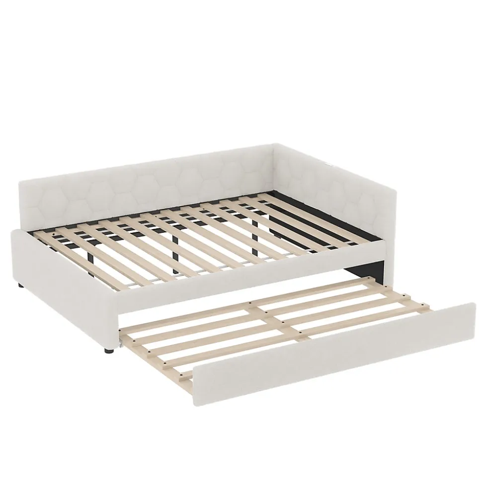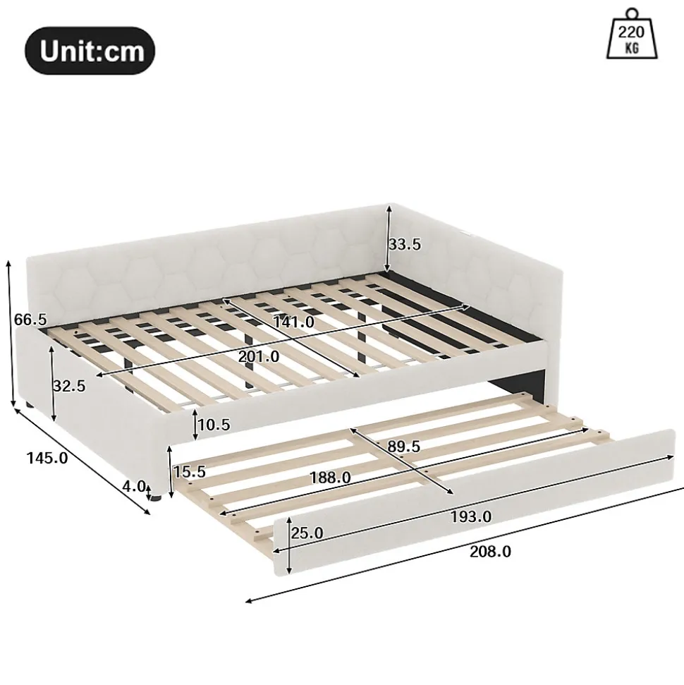 ▶ ▶ Détails ▶────────────────● Nom du produit : Lit gigogne● Matériau du lit : Vliesimitat + MDF● Taille : 140 × 200 cm (sans matelas)● Couleur : Blanc● Dimensions du produit : 208 × 145 × 66,5 cm (L x l x H)● Dimensions intérieures du lit : 140 × 200 cm● Hauteur totale : 66,5 cm● Capacité de charge : 220 kg● Dimensions intérieures du lit escamotable : 89,5 × 188 cm● Capacité de charge du lit escamotable : 80 kg● Épaisseur recommandée du matelas : 10–15 cm (lit principal), 10 cm (lit escamotable)● Montage requis : Oui● Nombre de colis : 2► Remarques ►※ Ce produit sera livré en 2 colis, qui peuvent ne pas arriver simultanément. Veuillez patienter.※ En raison de mesures manuelles, une erreur de 2–3 cm peut survenir.※ En raison de la lumière, des variations de couleur peuvent apparaître entre l’image du produit et le produit réel. Veuillez vous référer au produit reçu.