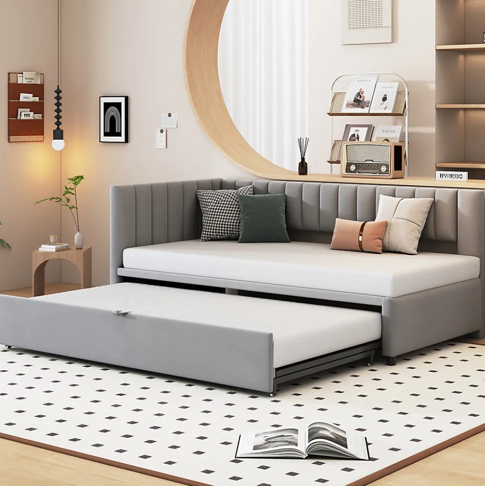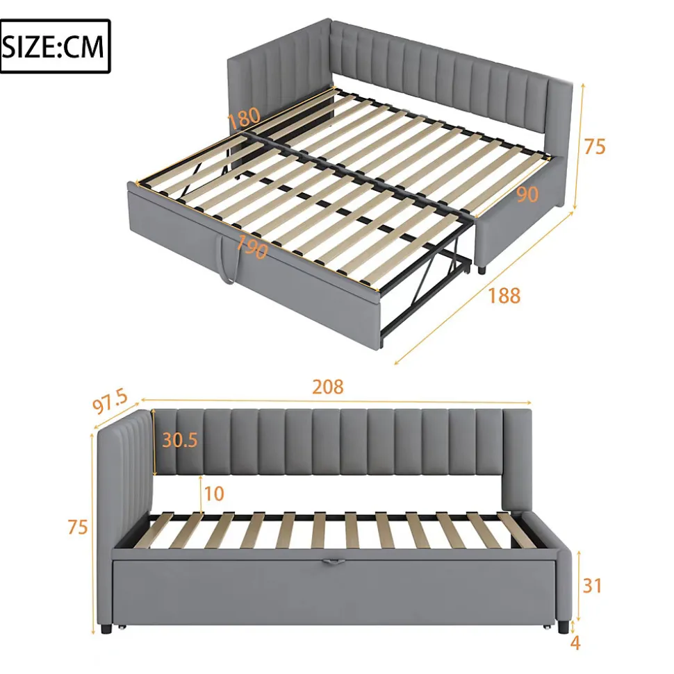 ▶ ▶ Détails ▶────────────────● Nom du produit : Lit gigogne● Dimensions totales du produit : 208 x 97,5 x 75 cm● Nombre de colis : 2● Poids total du produit : 45 kg● Capacité de poids : 120 kg● Épaisseur de matelas recommandée : 6-10 cm● Dimensions : 90 x 200 cm / 180 x 200 cm (matelas non inclus)● Couleur : Gris clair● Matériaux du produit : Velours + Contreplaqué + MDF● Poids total du colis : 49 kg● Nombre de lattes : 24● Temps estimé pour l’assemblage : 1 heure● Nombre de personnes recommandé : 2● Outils supplémentaires nécessaires : Tous les outils inclus (tournevis)► Remarques ►※ Ce produit sera livré en 2 colis, qui peuvent arriver séparément. Veuillez patienter.※ En raison des mesures manuelles, un écart de 2 à 3 cm peut se produire.※ En fonction de l’éclairage, il peut y avoir des différences de couleur entre l’image du produit et le produit réel. Veuillez vous référer au produit que vous recevez.※ Si vous avez des questions pendant l’installation, veuillez nous contacter dès que possible.