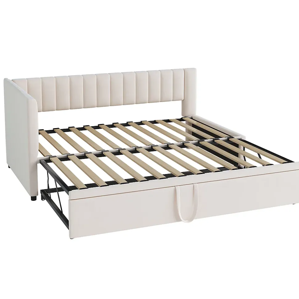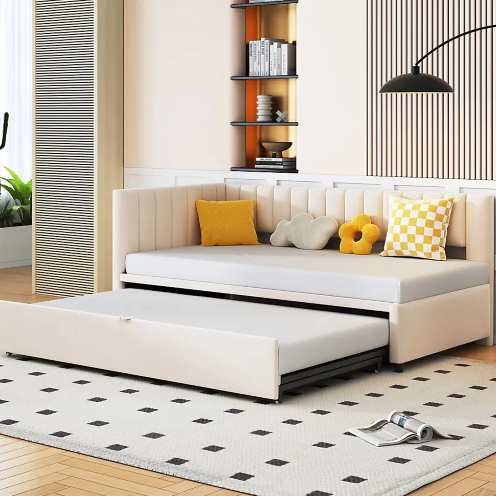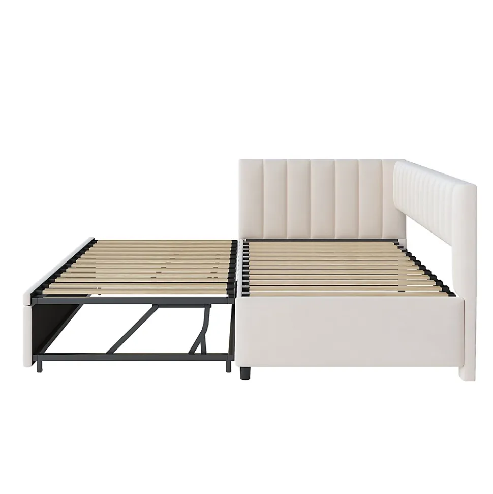 ▶ ▶ Détails ▶────────────────● Nom du produit : Lit gigogne● Dimensions totales du produit : 208 x 97,5 x 75 cm● Dimensions détaillées du produit : Veuillez consulter l’image des dimensions● Nombre de colis : 2● Poids total du produit : 45 kg● Capacité de poids : 120 kg● Épaisseur de matelas recommandée : 6-10 cm● Dimensions du matelas : 90 x 200 cm / 180 x 200 cm (matelas non inclus)● Couleur : Beige● Matériaux du produit : Velours + Contreplaqué + MDF● Poids total du colis : 49 kg● Nombre de lattes : 24● Temps estimé pour l’assemblage : 1 heure● Nombre de personnes recommandé : 2● Outils supplémentaires nécessaires : Tous les outils inclus (tournevis)► Remarques ►※ Ce produit sera livré en 2 colis, qui peuvent arriver séparément. Veuillez patienter.※ En raison des mesures manuelles, un écart de 2 à 3 cm peut se produire.※ En fonction de l’éclairage, il peut y avoir des différences de couleur entre l’image du produit et le produit réel. Veuillez vous référer au produit que vous recevez.※ Si vous avez des questions pendant l’installation, veuillez nous contacter dès que possible.