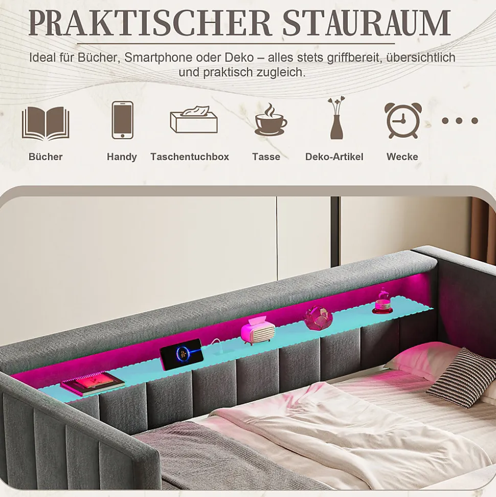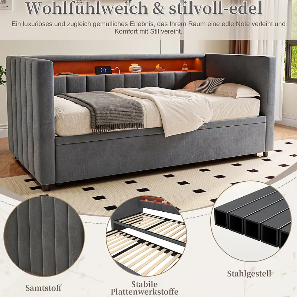 - 【Éclairage LED Ambiance】 Les LED intégrées créent une ambiance chaleureuse et agréable. Vous pouvez ajuster la luminosité pour l’adapter à vos besoins, que ce soit pour une soirée tranquille, une veilleuse douce ou une atmosphère apaisante, tout en mettant en valeur le revêtement en velours du canapé-lit.