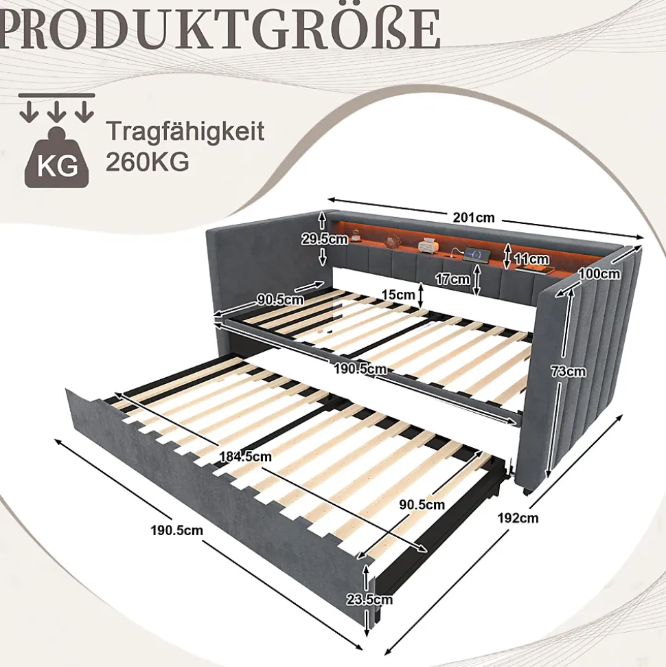 ▶ ▶ Détails ▶────────────────● Nom du produit : Lit Gigogne● Couleur : Gris● Matériau : Velours● Dimensions du cadre de lit : 90 × 190 cm● Dimensions du produit : 201 × 100–192 × 73 cm (L × l × H)● Poids net / Poids brut : 46,8 kg / 52,57 kg● Capacité de charge maximale : 260 kg● Montage requis : Oui● Matrice applicable (non incluse) : 10–15 cm● Nombre de colis : 2► Remarques ►※ En raison de mesures manuelles, un écart de 2 à 3 cm peut se produire.※ Les images du produit sont réelles, mais de légères différences de couleur peuvent apparaître selon la lumière et les conditions de prise de vue.※ Le produit est livré en 2 colis, qui peuvent ne pas arriver en même temps. Merci de votre patience.