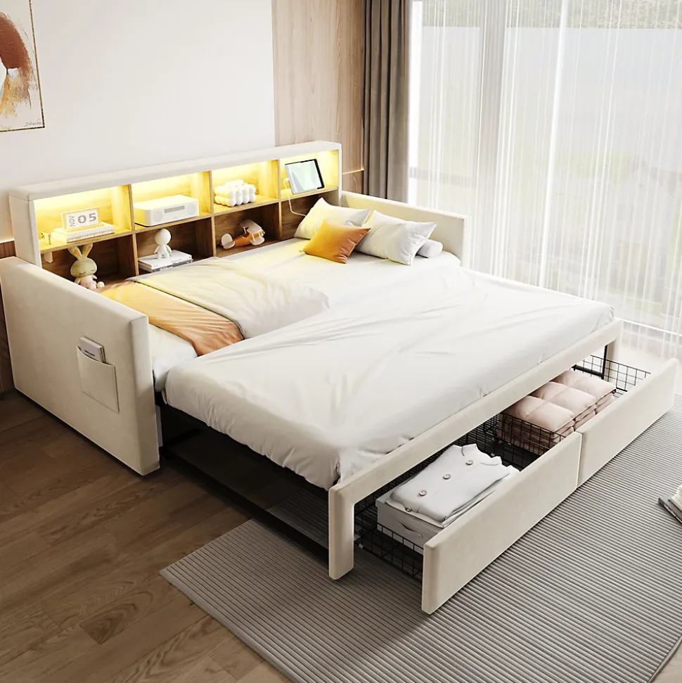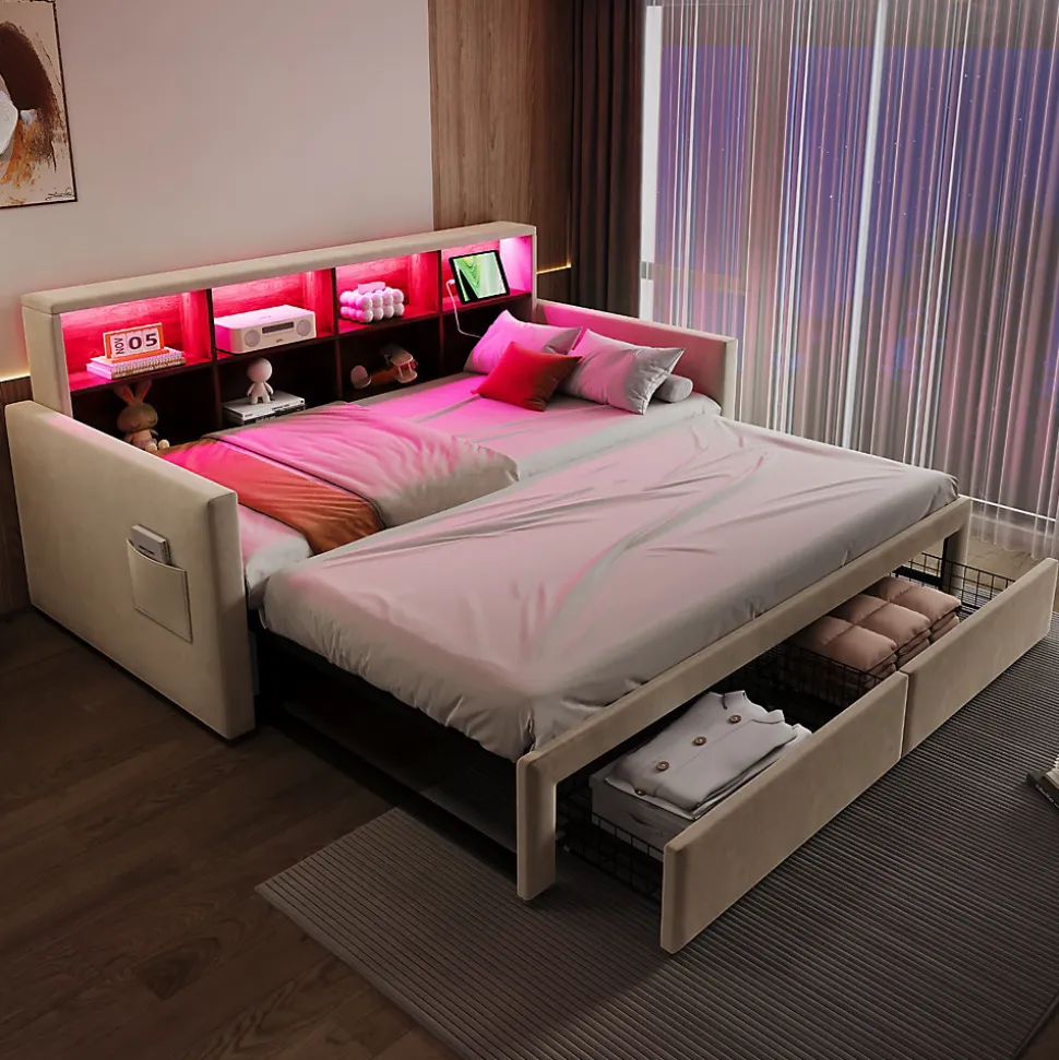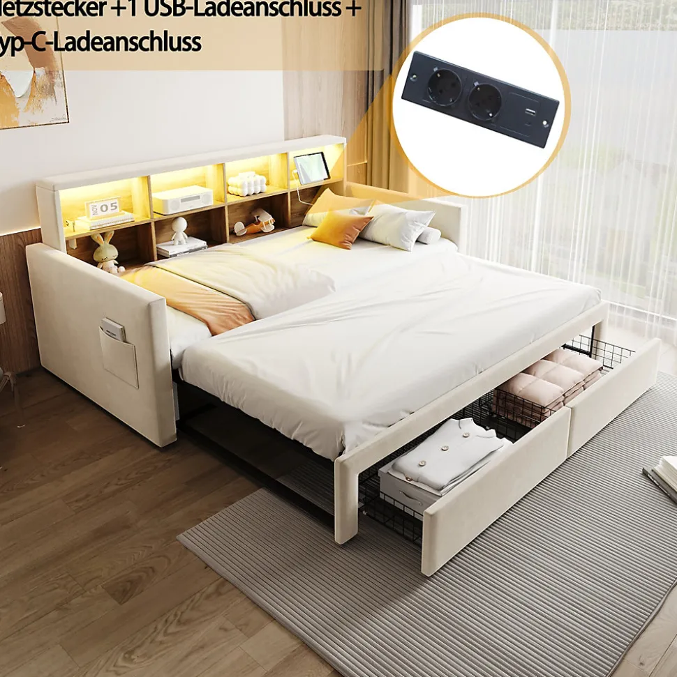 ▶ ▶ Détails ▶────────────────● Type de produit : Lit extensible● Dimensions de la surface de couchage : 90 × 190 cm (sans matelas)● Couleur : Beige● Matériaux du produit : Velours + Métal + Contreplaqué + MDF● Dimensions totales du produit : 204 × 104 × 96 cm● Poids du produit : 46 kg● Capacité de charge : 300 kg● Nombre de lattes : 21● Epaisseur de matelas recommandée : 6 à 8 cm● Nombre de colis : 2● Poids total des colis : 50 kg● Montage requis : Oui● Temps de montage estimé : Environ 1 heure● Nombre de personnes recommandé : 2● Outils supplémentaires : Tous les outils inclus (tournevis requis)● Utilisation d’outils électriques à éviter : Oui● Design unique : Tête de lit avec compartiments de rangement intégrés, bande lumineuse LED, prises de charge, deux tiroirs sous le lit► Remarques ►※ Ce produit est livré en 2 colis.※ Des écarts de 1 à 3 cm peuvent survenir en raison des mesures manuelles.※ Des variations de couleur peuvent apparaître en raison de la lumière ou de l’affichage des écrans.※ Veuillez vérifier tous les accessoires avant le montage.※ Ce produit prend en charge les personnalisations sur mesure, veuillez contacter le vendeur pour plus de détails.