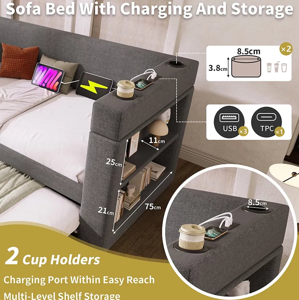 - 【Équipement fonctionnel】 Les accoudoirs sont dotés de ports USB et Type-C, ainsi que d’un porte-gobelet et d’étagères ouvertes, permettant une organisation optimale de votre espace de vie.