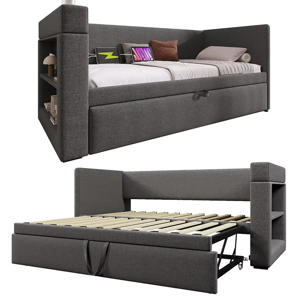 ▶ ▶ Détails ▶────────────────● Dimensions totales : 98 x 207 x 74 cm● Matériau principal : Bois + Coton + Métal● Couleur : Gris● Montage : Requis● Contenu du colis : Lit principal + Lit gigogne + Station de charge● Matelas applicable (lit principal) : 90 x 190 cm (Matelas non inclus)● Épaisseur de matelas recommandée : 15 cm● Poids maximal utilisateur : 150 kg● Nombre de colis : 2● Poids net / brut : 48,85 kg / 54,29 kg► Remarques ►※ Ce produit est livré en 2 colis, qui peuvent arriver séparément. Merci de patienter.※ Les mesures manuelles peuvent entraîner une erreur de 2–3 cm.※ Des différences de couleur peuvent apparaître entre l’image du produit et le produit réel en raison de l’éclairage. Veuillez vous référer au produit réellement reçu.