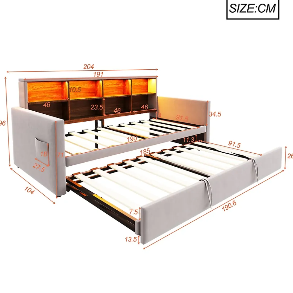 ▶ ▶ Détails ▶────────────────● Type de produit : Lit extensible● Taille : 90 × 190 cm (sans matelas)● Fonction extensible : Oui, lit gigogne extensible● Surface de couchage maximale dépliée : Jusqu’à environ 180 cm de largeur● Couleur : Gris clair● Matériau de revêtement : Velours● Matériaux du produit : Velours + Métal + Contreplaqué + MDF● Dimensions totales du produit : 204 × 104 × 96 cm● Poids du produit : 49 kg● Nombre de colis : 2● Capacité de charge : 300 kg● Nombre de lattes : 20● Epaisseur de matelas recommandée : 6 à 8 cm (90 × 190 cm)● Ports de charge : Prise + USB + Type-C● Niveau de montage : Pré-montage / montage complet requis● Temps de montage estimé : Environ 1 heure● Nombre de personnes recommandé : 2 personnes● Outils supplémentaires : Tournevis (tous les outils inclus)► Remarques ►※ Ce produit est livré en 2 colis.※ Des écarts de 2 à 3 cm peuvent survenir en raison des mesures manuelles.※ Les images sont prises à partir de produits réels, des différences de couleur peuvent apparaître selon la lumière et les écrans.※ Le matelas n’est pas inclus.※ En cas de questions pendant l’installation, veuillez nous contacter à tout moment.