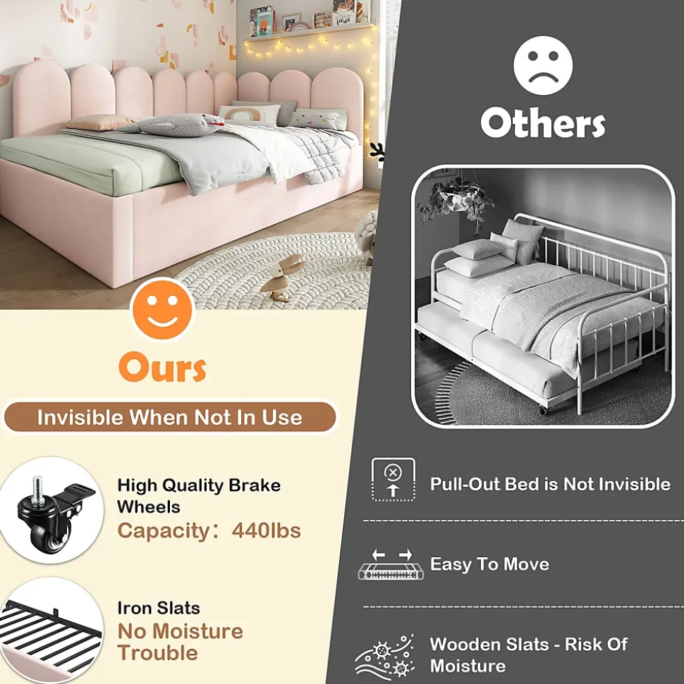 ▶ ▶ Détails ▶────────────────● Dimensions totales : 203 x 97 x 76 cm● Matériau : Velours + Métal + Contreplaqué● Couleur : Rose● Montage requis : Oui● Contenu de l’emballage : Lit principal + Lit gigogne● Capacité de charge maximale : 272 kg● Poids brut / net : 37,1 / 32 kg● Nombre de colis : 2●● Matelas ●●● Matelas applicable (lit principal) : 90 x 200 cm● Matelas applicable (lit gigogne) : 90 x 190 cm● Épaisseur recommandée du matelas : 15 cm► Remarques ►※ Ce produit est livré en 2 colis, qui peuvent arriver séparément. Merci de votre patience.※ En raison de la mesure manuelle, une erreur de 2 à 3 cm peut se produire.※ Toutes les images du produit sont prises à partir du produit réel, mais des différences de couleur peuvent survenir à cause de la lumière ou d’autres facteurs.※ La longueur correspond à l’avant et la largeur aux côtés. La taille exacte dépend de l’image.