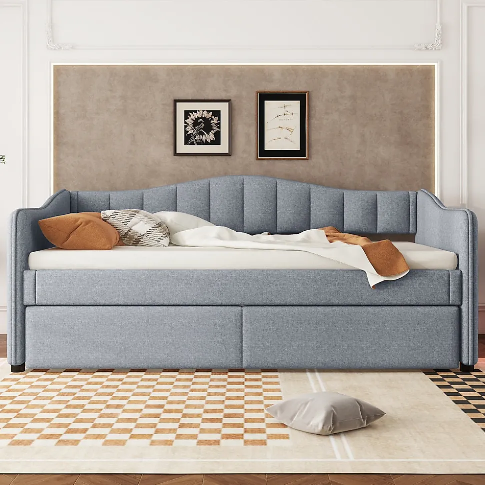 ▶ ▶ Détails ▶────────────────● Nom du produit : Canapé-lit● Dimensions du produit : 212 x 99 x 85 cm● Matériau du lit : Linen + MDF● Taille : 90 x 200 cm (sans matelas)● Couleur : Gris● Nombre de colis : 2● Montage requis : Oui● Dimensions intérieures du lit : 90 x 200 cm● Hauteur totale : 85 cm● Capacité de poids : 120 kg● Nombre de lattes : 18 pièces● Épaisseur recommandée du matelas : 10-15 cm● Dimensions intérieures du lit roulant : 90 x 200 cm (sans matelas)● Capacité de poids du lit roulant : 80 kg● Épaisseur recommandée du matelas pour le lit roulant : 10 cm► Remarques ►※ Ce produit est livré en 2 colis. Ils peuvent arriver séparément. Merci de patienter.※ En raison de mesures manuelles, une erreur de 2 à 3 cm peut survenir.※ En raison de l’éclairage, des différences de couleur peuvent apparaître entre l’image du produit et le produit réel. Merci de vous référer au produit que vous avez effectivement reçu.※ Si vous avez des questions lors de l’installation, veuillez nous contacter dès que possible.