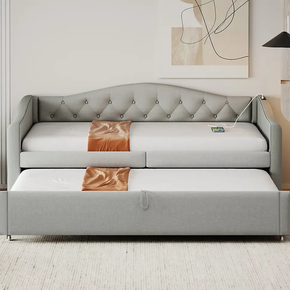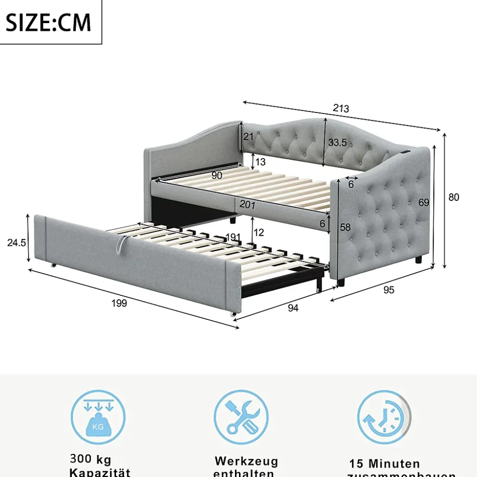 ▶ ▶ Détails ▶────────────────● Nom du produit : Lit gigogne● Dimensions totales du produit : 213 x 95 x 80 cm● Dimensions détaillées : Veuillez consulter l’image des dimensions● Nombre de colis : 2● Capacité de charge : 300 kg● Épaisseur de matelas recommandée : 12-14 cm (90 x 200 cm)● Épaisseur de matelas recommandée pour le lit extensible : 8-10 cm (90 x 190 cm)● Taille : 90 x 200 cm (sans matelas)● Couleur : Gris● Matériaux : Lin + Métal + Contreplaqué + MDF● Nombre de lattes : 24● Poids total du produit : 51 kg● Poids total du colis : 55 kg● Niveau de montage : Montage complet requis / Montage partiel● Temps de montage estimé : 1 heure● Nombre de personnes recommandé : 2● Outils supplémentaires requis : Tous les outils inclus / Tournevis● Évitez l’utilisation d’outils électriques : Oui► Remarques ►※ Ce produit est expédié en 2 colis. Ils peuvent arriver séparément. Veuillez patienter.※ En raison de la mesure manuelle, une erreur de 2 à 3 cm peut se produire.※ En raison des conditions d’éclairage, il peut y avoir une légère différence de couleur entre l’image du produit et le produit réel. Veuillez vous référer au produit reçu.※ Si le client rencontre des questions lors de l’installation, veuillez nous contacter dès que possible.