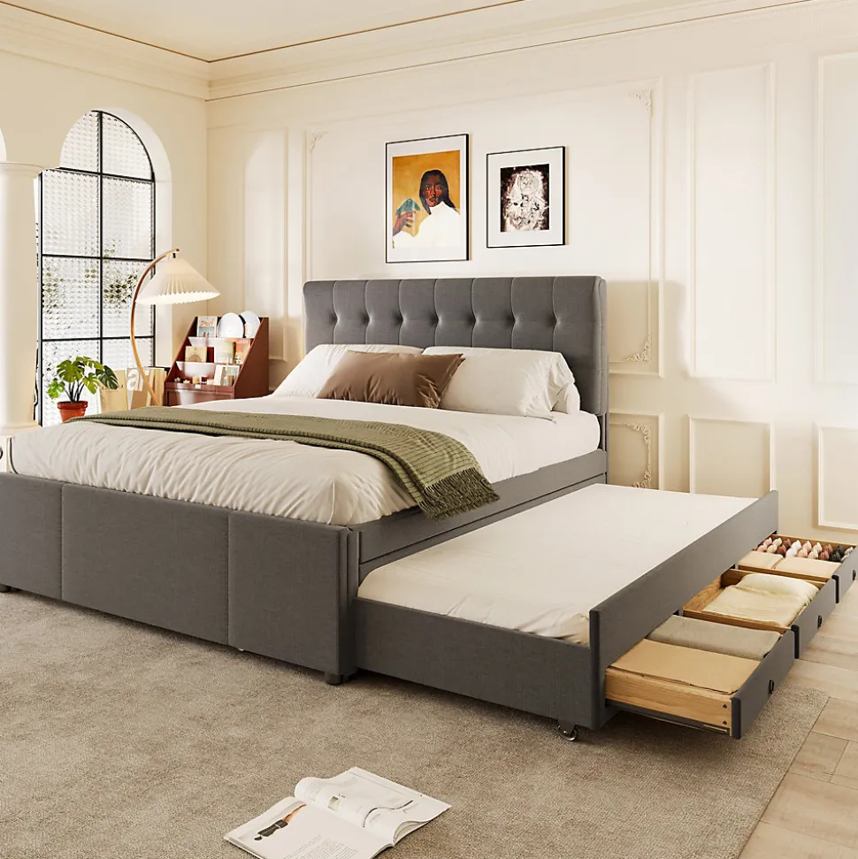 - 【Espace de rangement】 Les trois tiroirs intégrés sous le lit permettent de ranger vêtements, linge de lit et couvertures, réduisant l’encombrement et facilitant une organisation quotidienne plus fluide.
