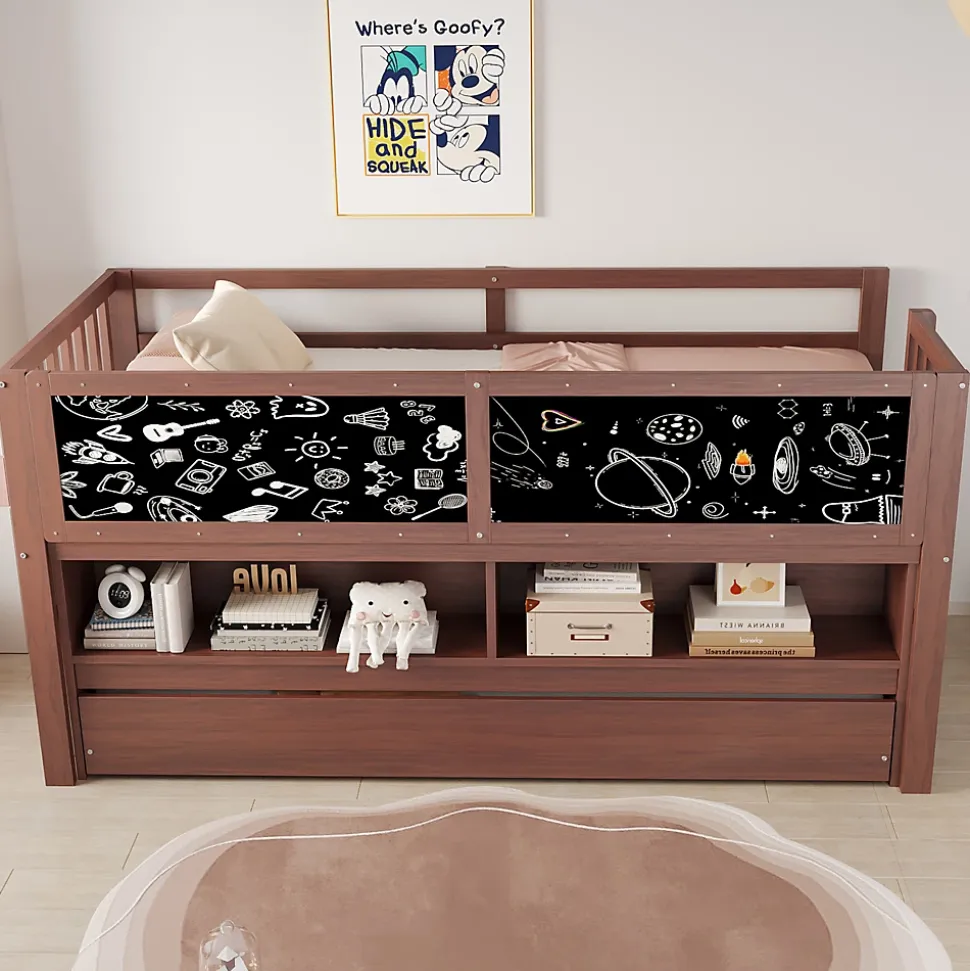 - 【Surface Tablier Interactif】 Les côtés du lit sont équipés de surfaces en tableau noir sur lesquelles les enfants peuvent dessiner et écrire. Cela stimule leur créativité et transforme le coucher en une activité ludique tout en décorant la chambre avec des œuvres personnelles.