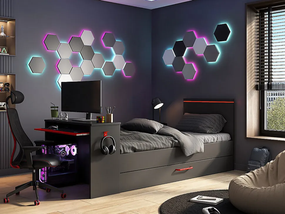 Le lit VOUANI dispose d’un bureau pour vous permettre de créer votre propre espace de jeu. Ce dernier est équipé d’une tablette pour disposer votre clavier mais également d’une accroche pour ranger votre casque. Les LEDs rouges installées sur ce lit viendront créer une ambiance gaming de professionnel dans votre chambre. Avec son double couchage, VOUANI répondra aux attentes de tout gamer en herbe pour vous permettre de devenir le maître du jeu !1 x Cadre de lit VOUANICaractéristiques Couleur (nuance) : Gris anthracite Matière (précision) : Panneau de particule Finition : Mélaminé Taille (couchage) : 90 x 200 cm Nombre de places : 1 place Avec leds Couleur des LEDs : Rouge Type de commande : Interrupteur Type de branchement : Prise USB Sans matelas Avec bureau Gamme : Good for Planet Produit : Fabriqué en Europe Charge maximale supportée : 100 kg À monter soi-même : 1 crochet en métal pour accrocher un casque : 1 tablette sous le bureau pour le clavier : Finition en fibre de carbone sur les bords du bureau et du lit Charge maximale bureau : 14 kg Charge maximale de la tablette : 4 kg : Ce lit est compatible avec tous les matelas et sommiers 90 x 200 cmDimensions Longueur : 242.8 cm Hauteur : 100.5 cm Profondeur : 98.7 cm Hauteur de couchage : 43 cm Hauteur maximale du matelas gigogne : 18,6 cm1 x Cadre à lattes KALISTACaractéristiques Couleur (nuance) : Noir Matière (précision) : Métal Epaisseur métal : 1.2 mm Taille (couchage) : 90 x 200 cm Nombre de places : 1 place Sans pieds Technologie (sommier) : Lattes actives Nombre de lattes : 19 lattes Matière des lattes : Bois (peuplier) Charge maximale supportée : 200 kg À monter soi-même : Cadre métal laqué epoxy cintré sur chantDimensions Longueur : 198 cm Hauteur : 5 cm Profondeur : 88 cmLivraisonLors de la livraison, il est conseillé de vérifier que le bon nombre de colis a été livré.Colis1 x Cadre de lit VOUANIColis n°1 : Longueur 106 cm, Largeur 77 cm, Hauteur 9 cm, Poids 35 kg. Colis