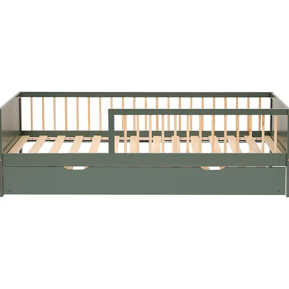 Description : Le lit ADAM, mesurant 190x90cm, est idéal pour la chambre de votre enfant. Fabriqué en bois de pin avec des lattes contreplaquées, il assure robustesse et confort. Son design épuré s’intègre parfaitement dans tout style de décoration. Le lit ADAM est équipé d’un tiroir-lit pratique, parfait pour héberger un invité ou pour une soirée pyjama entre frères et sœurs. Ce lit astucieux optimise l’espace et aide à garder la chambre bien organisée ! Détails : Dimensions : – Lit : L 195 x l 96 x H 60cm- Matelas requis : L 190 x l 90cm- Hauteur max. matelas : 20cm- Hauteur de la barrière : 60cm- Hauteur sous sommier : 21,2cm- Lit tiroirs : L 190 x l 94 x H 21,5cm- Matelas lit tiroirs requis : L 190 x l 90 x H 13cm- Pieds : L 5 x l 5 x H 21,2cm Matières : – Lattes : contreplaqué- Structure : bois de pin Couleurs : – Structure : vert Informations complémentaires : – Utilisation : intérieur- Type de public : enfant- Type d’utilisation : quotidienne- Type de lit : gigogne- Nombre de couchage : 2 x 1 personne- Sommier à lattes inclus- Tiroirs-lit inclus- Matelas non inclus- Poids max. supporté lit : 160kg / lit tiroir : 150kg- À monter (notice incluse) – Garantie : 2 ans Livraison : Contenu colis : 1 lit + 1 lit-tiroirLivraison effectuée en pas de porte, en bas d’immeuble – Livraison en 1 colisColis 1 : L 199 × l 35 × H 14,5cm – poids brut : 18kg / poids net : 16,5kgColis 2 : L 200 × l 25 × H 12cm – poids brut : 13kg/poids net : 12kg