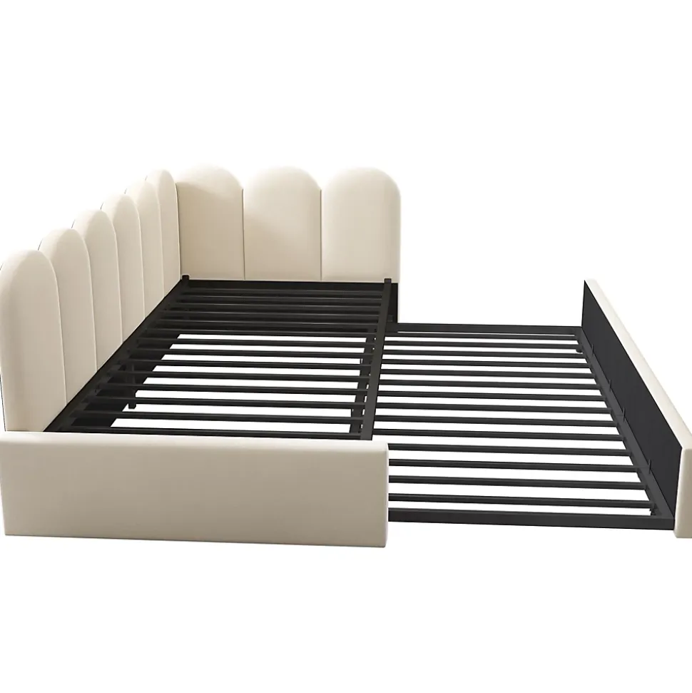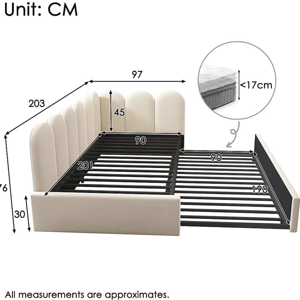 ▶ ▶ Détails ▶────────────────● Nom du produit : Lit banquette● Dimensions totales : 203 x 97 x 76 cm● Matériau du plateau : Velours + métal + contreplaqué● Couleur : Beige● Contenu de l’emballage : Lit principal + lit gigogne● Montage requis : Oui● Matelas compatible (lit principal) : 90 x 200 cm● Matelas compatible (lit gigogne) : 90 x 190 cm● Épaisseur de matelas recommandée (matelas non inclus) : 15 cm● Poids maximal supporté : 272 kg● Poids brut/net : 37,1 kg / 32 kg● Nombre de colis : 2► Remarques ►※ Ce produit est expédié en 2 colis, qui peuvent arriver séparément. Merci de votre patience.※ En raison de la mesure manuelle, une erreur de 2 à 3 cm peut se produire.※ Les photos sont prises à partir de produits réels, mais des différences de couleur peuvent apparaître en raison de la lumière ou d’autres facteurs.※ La longueur correspond à la valeur avant et la largeur à la valeur latérale. Veuillez vous référer à l’image pour les dimensions exactes.