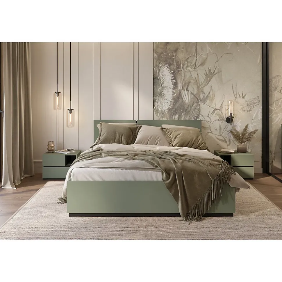 Lit HAVANA 160×200 cm – Coloris vert sauge et noir – Sommier inclus – Structure robuste et design moderneOffrez à votre chambre une atmosphère douce et contemporaine avec le lit HAVANA 160×200 cm en coloris vert sauge et noir. Son design structuré et sa tête de lit haute en font une pièce maîtresse idéale pour les intérieurs modernes. Le sommier est inclus pour vous offrir un confort optimal dès l’installation.Fabriqué en panneaux de particules de première qualité avec des chants soignés, ce lit vous assure une structure stable, résistante et facile à entretenir. Le vert sauge mat, associé à des finitions noires, crée un équilibre visuel élégant et tendance.Caractéristiques du produit :Type de produit : Lit 2 places 160×200 cmCollection : HAVANADimensions : L164,1 cm x H90,8 cm x P204,6 cmColoris : Vert sauge / NoirMatériau : Panneaux de particules 18 mm – Finitions vert sauge mat et noirSommier : InclusNombre de colis : 2Poids total : 75 kgMontage : À assembler soi-même – notice fournieAvantages du lit HAVANA :Design contemporain : Une silhouette moderne avec une belle combinaison de vert sauge et noir.Prêt à l’emploi : Livré avec sommier inclus pour plus de praticité.Coordination idéale : Se marie parfaitement avec les autres meubles HAVANA.Pourquoi choisir ce lit ?Esthétique et confort : Tête de lit haute, finitions mates et sommier inclus.Solidité garantie : Conception robuste et durable pour un usage quotidien.Style universel : S’adapte à tout type de chambre moderne ou naturelle.Le lit HAVANA est disponible en plusieurs dimensions (160×200, 180×200 cm) et coloris (chêne, beige, blanc et noir, vert sauge). Il se décline également en version avec ou sans coffre de rangement selon vos besoins d’organisation.Associez-le aux autres meubles de la collection HAVANA pour créer une chambre élégante et harmonieuse. Découvrez d’autres modèles dans la catégorie Lit.