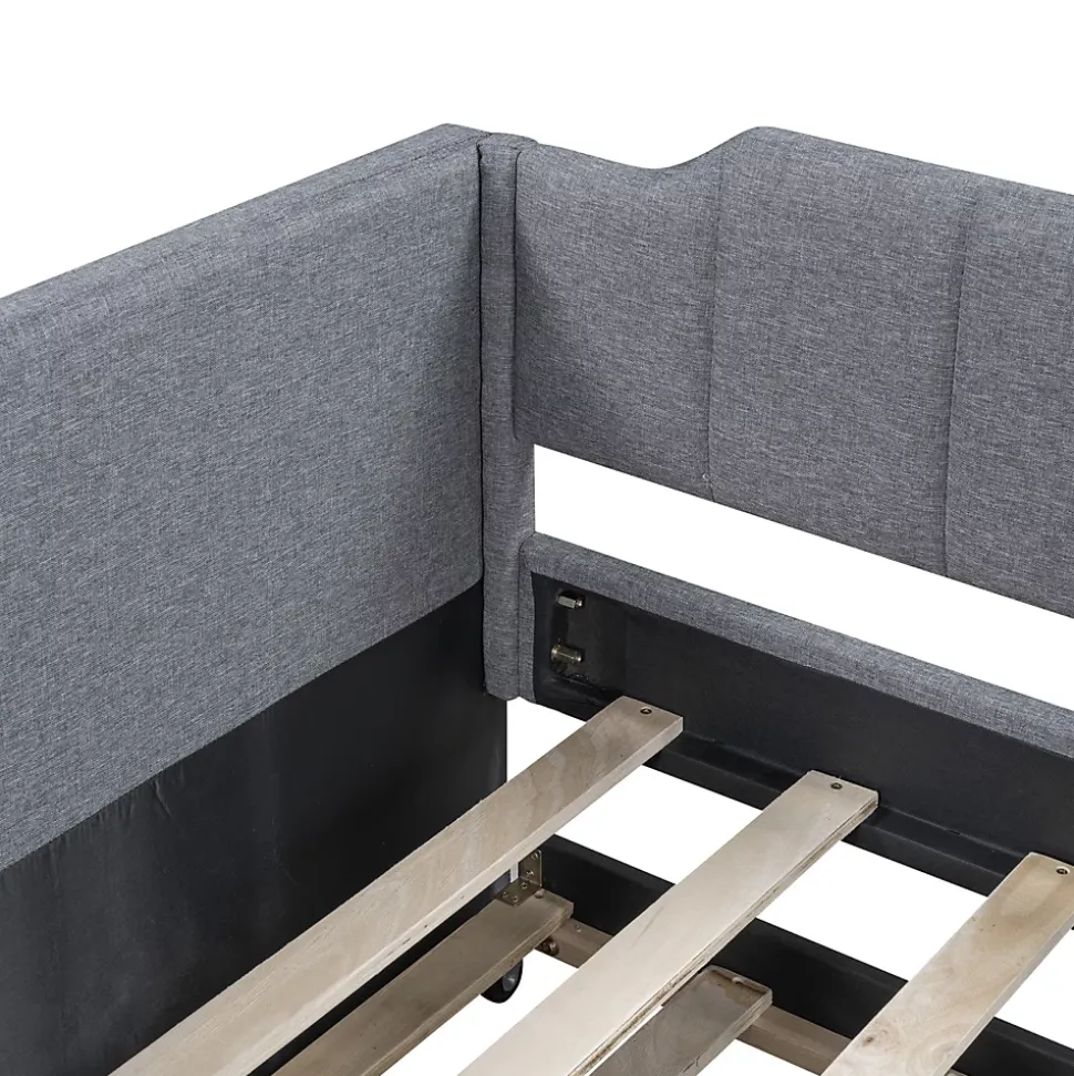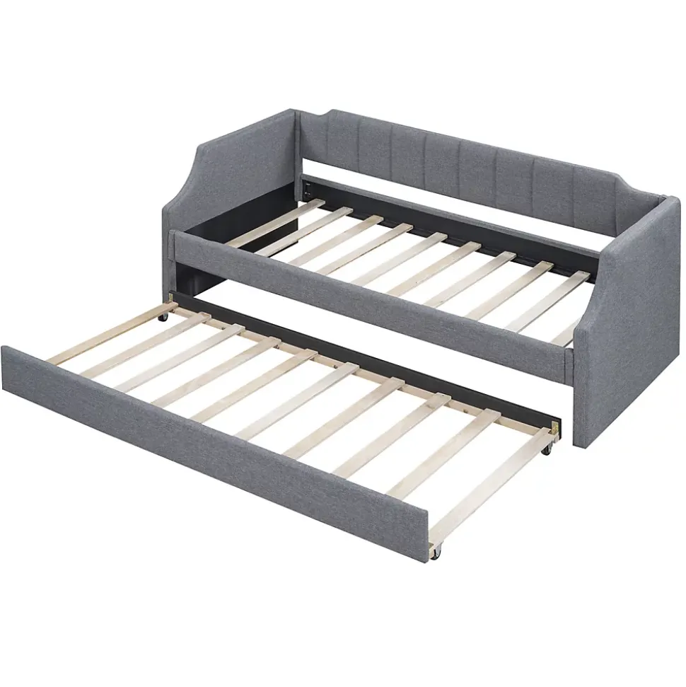 Canapé-lit avec Lit Escamotable, GrisTransformez votre salon en chambre d’amis grâce à ce canapé-lit pratique. Il offre une place pour deux personnes en haut et un lit escamotable pour deux autres en dessous, idéal pour les familles ou les invités. Fabriqué avec un cadre en bois massif et un revêtement en polyester gris, il s’intègre facilement dans de nombreux styles de décoration intérieure.Caractéristiques principales :Design confortable : Le dos incurvé et les accoudoirs offrent un excellent soutien pour se détendre.Lit escamotable : Le lit escamotable se déplie facilement grâce à des roulettes pratiques, offrant ainsi un couchage supplémentaire.Matériaux robustes : Le polyester et le contreplaqué assurent la durabilité et la résistance.Montage facile : Toutes les pièces sont étiquetées pour un montage facile et rapide.Dimensions :Dimensions du produit : 213 x 97 x 81 cmDimensions du lit / Lit escamotable : 90 x 200 cm / 90 x 190 cmHauteur totale : 81 cmCapacité de charge : 120 kgNombre de lattes : 10Recommandation pour l’épaisseur du matelas : 15-20 cm pour le canapé-lit, 10-25 cm pour le lit escamotableMontage requis : OuiOrigine : Vietnam