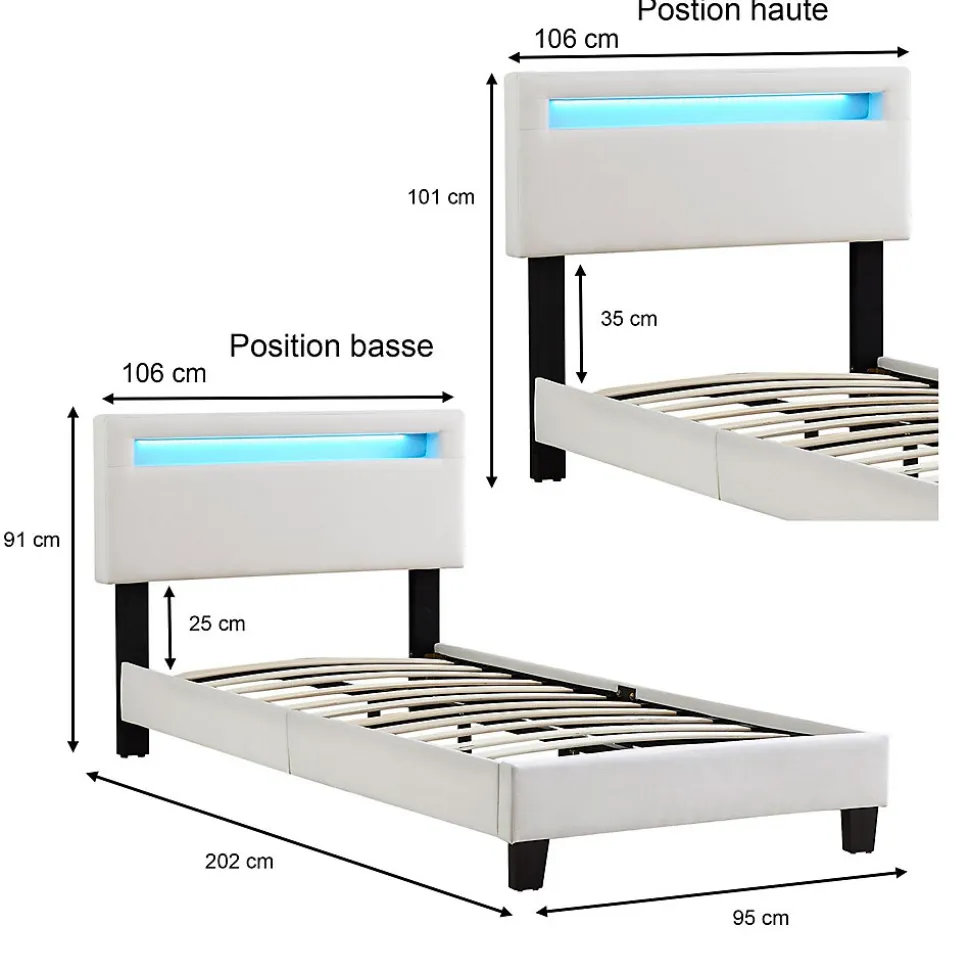 Le lit led simple Austin … amènera une touche de modernité dans votre chambre grâce à son revêtement en tissu capitonné, à la fois élégant et intemporel. L’éclairage LED intégré dans la tête de lit sera parfait pour apporter une ambiance chaleureuse et passer une bonne nuit de sommeil. Le plus de ce lit, vous pouvez régler la hauteur de la tête de lit au montage selon 3 positions, ainsi vous pouvez ajuster ce lit selon votre taille ou la taille de votre matelas. Description des matériaux : – La structure du lit est recouverte d’un revêtement en tissu capitonné de coloris blanc. – Les pieds du lit sont en plastique de coloris noir. – Les lattes du sommier sont en contreplaqué. Caractéristiques du produit : – Lit simple 90 x 190 cm – Hauteur pieds de lit : 25 cm – Eclairage avec LED intégrées – Hauteur tête de lit (position basse) : 91 cm – Hauteur tête de lit (position moyenne) : 96 cm – Hauteur tête de lit (position haute) : 101 cm – Sommier à lattes inclus Livraison et montage : – Contenu de la livraison : lit, sommier, notice de montage – Le produit est livré en pièces détachées – Assemblage facile grâce à la notice – Livré sans matelas et sans décoration – Photo non contractuelle Résumé: – Hauteur tête de lit: 101 cm – Profondeur d’insertion: 4 cm – Convient uniquement avec: Sommier fagot à lattes – Description du matériel: 100% Polyester – Extras: Avec sommier à lattes – Traverse avec pied d’appui: Oui – Dimensions monté: 101 x 202 x 106 cm (H x L x L) – Couchage: 90 x 190 cm – Couleur: Blanc – Matériel: Tissu de recouvrement