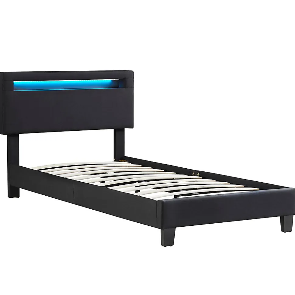 Le lit led simple Austin … amènera une touche de modernité dans votre chambre grâce à son revêtement en tissu capitonné, à la fois élégant et intemporel. L’éclairage LED intégré dans la tête de lit sera parfait pour apporter une ambiance chaleureuse et passer une bonne nuit de sommeil. Le plus de ce lit, vous pouvez régler la hauteur de la tête de lit au montage selon 3 positions, ainsi vous pouvez ajuster ce lit selon votre taille ou la taille de votre matelas. Description des matériaux : – La structure du lit est recouverte d’un revêtement en tissu capitonné de coloris noir. – Les pieds du lit sont en plastique de coloris noir. – Les lattes du sommier sont en contreplaqué. Caractéristiques du produit : – Lit simple 90 x 190 cm – Hauteur pieds de lit : 25 cm – Eclairage avec LED intégrées – Hauteur tête de lit (position basse) : 91 cm – Hauteur tête de lit (position moyenne) : 96 cm – Hauteur tête de lit (position haute) : 101 cm – Sommier à lattes inclus Livraison et montage : – Contenu de la livraison : lit, sommier, notice de montage – Le produit est livré en pièces détachées – Assemblage facile grâce à la notice – Livré sans matelas et sans décoration – Photo non contractuelle Résumé: – Hauteur tête de lit: 101 cm – Profondeur d’insertion: 4 cm – Convient uniquement avec: Sommier fagot à lattes – Description du matériel: 100% Polyester – Extras: Avec sommier à lattes – Traverse avec pied d’appui: Oui – Dimensions monté: 101 x 202 x 106 cm (H x L x L) – Couchage: 90 x 190 cm – Couleur: Noir – Matériel: Tissu de recouvrement