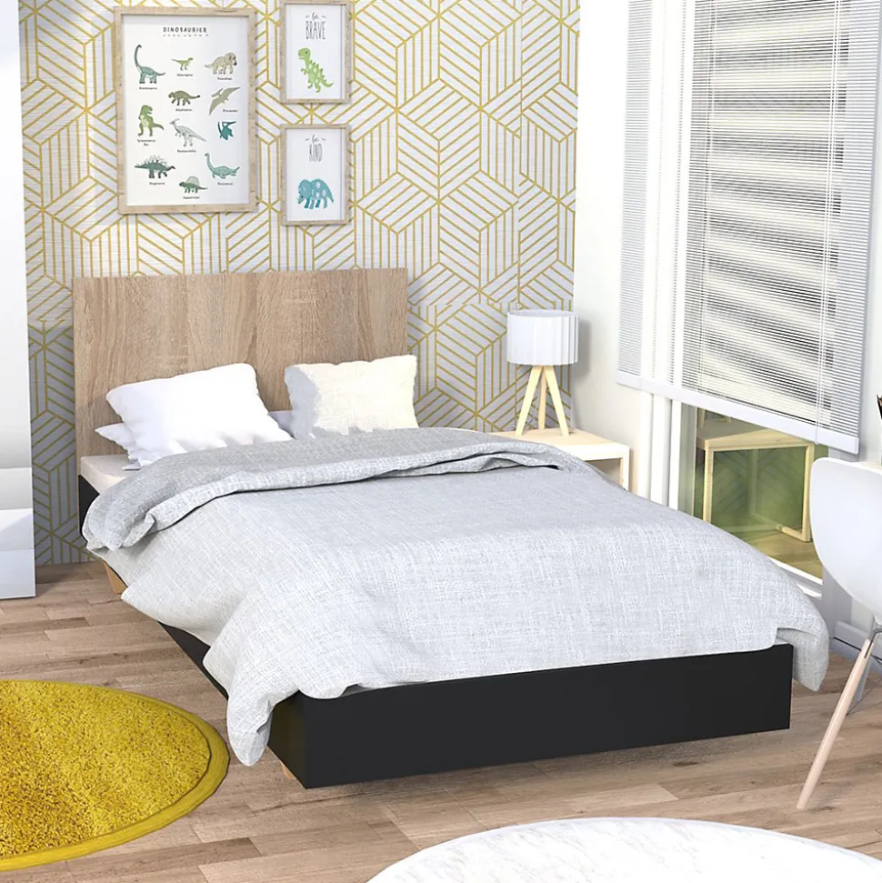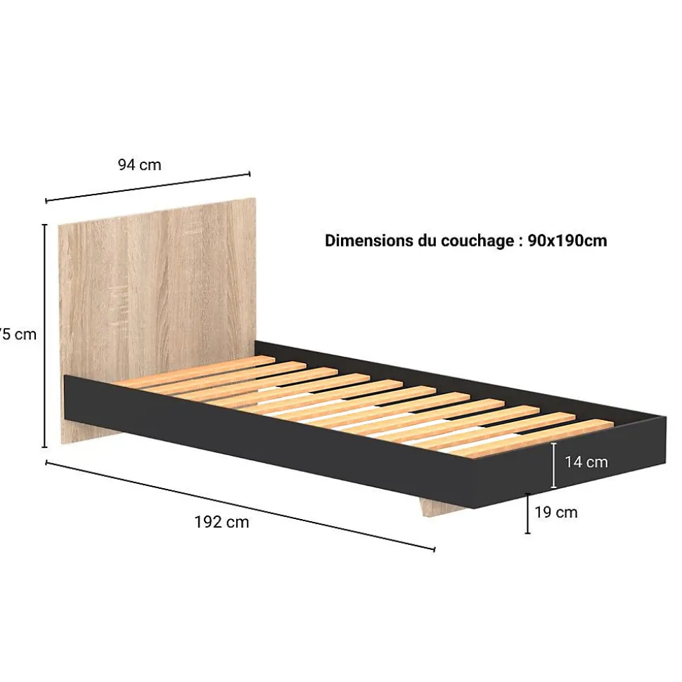 Lit LOFT 90×190 cmQue vous soyez à la recherche d’un style moderne, bohème ou encore scandinave, le lit LOFT saura s’intégrer à votre décoration. Avec son design pur et intemporel, il est parfaitement adapté pour une chambre d’enfant.Caractéristiques : Structure en panneau de particules.12 lattes multiplis.Finition : noir et décor chêne blanchi.Livré démonté avec un sommier et sans matelas. A monter soi-mêmeDimensions:192x94x75 cm