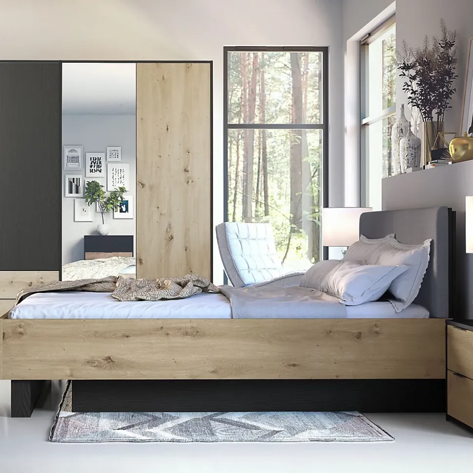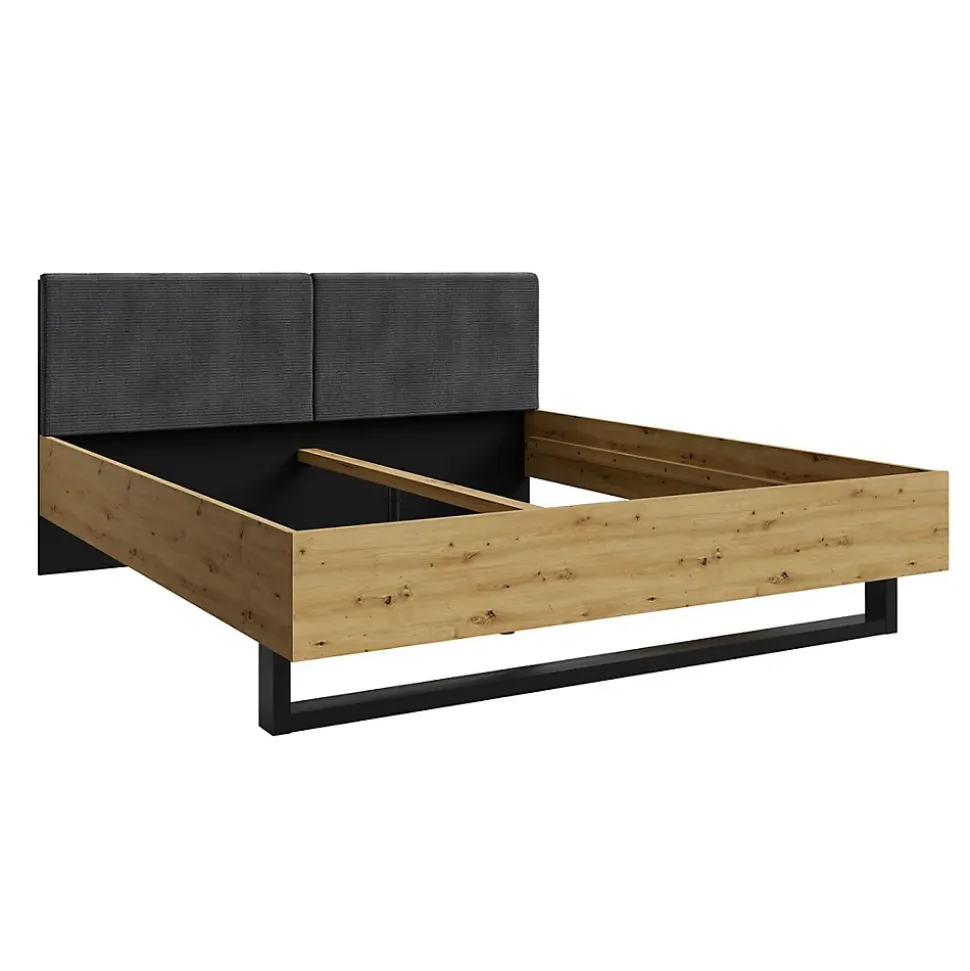 Lit 160×200 sans coffre – Noir graphite et chêne clair – Collection MELODYAjoutez une touche d’élégance et de confort à votre chambre avec le lit 160×200 de la collection MELODY, dans sa version sans coffre. Sa tête de lit rembourrée offre un appui confortable pour vos moments de lecture ou de détente. Le mariage subtil du noir graphite et du chêne clair crée une atmosphère moderne et chaleureuse.Lit adulte 160×200 cm sans coffre – Design épuré et ambiance contemporaineAvec ses dimensions finales de L166 x H98 x P211 cm, ce lit 2 places est conçu pour accueillir un matelas standard 160×200 cm (non fourni). Il est également livré sans sommier, vous laissant la liberté de choisir la base qui vous convient le mieux. Son design sobre et élégant s’intègre facilement dans tous types d’intérieurs.Structure résistante et finitions modernesLe lit MELODY est fabriqué en panneaux de particules haute densité, reconnus pour leur robustesse et leur longévité. Facile à entretenir avec un chiffon microfibre humide, il est aussi esthétique que fonctionnel. Il est livré en 5 colis pour un poids total de 47 kg.Les avantages du lit MELODY sans coffre avec tête rembourréeDesign moderne avec finition noir graphite et chêne clairTête de lit rembourrée pour plus de confortMatelas et sommier non inclus – à adapter selon vos besoinsStructure en panneaux de particules de qualité supérieureGarantie 2 ans – Fabrication européenneDécouvrez toutes les déclinaisons de la collection MELODY ainsi que d’autres inspirations dans notre catégorie Lit.