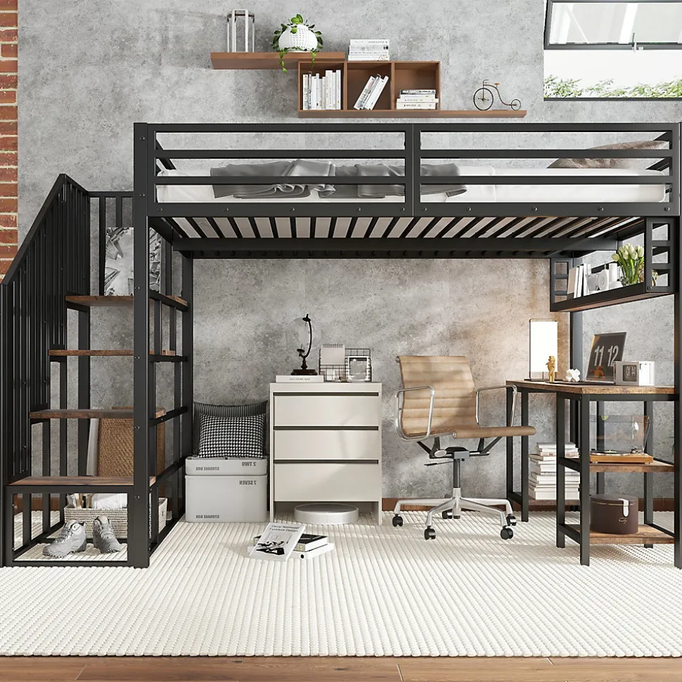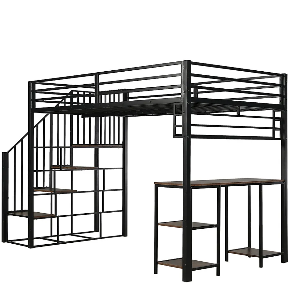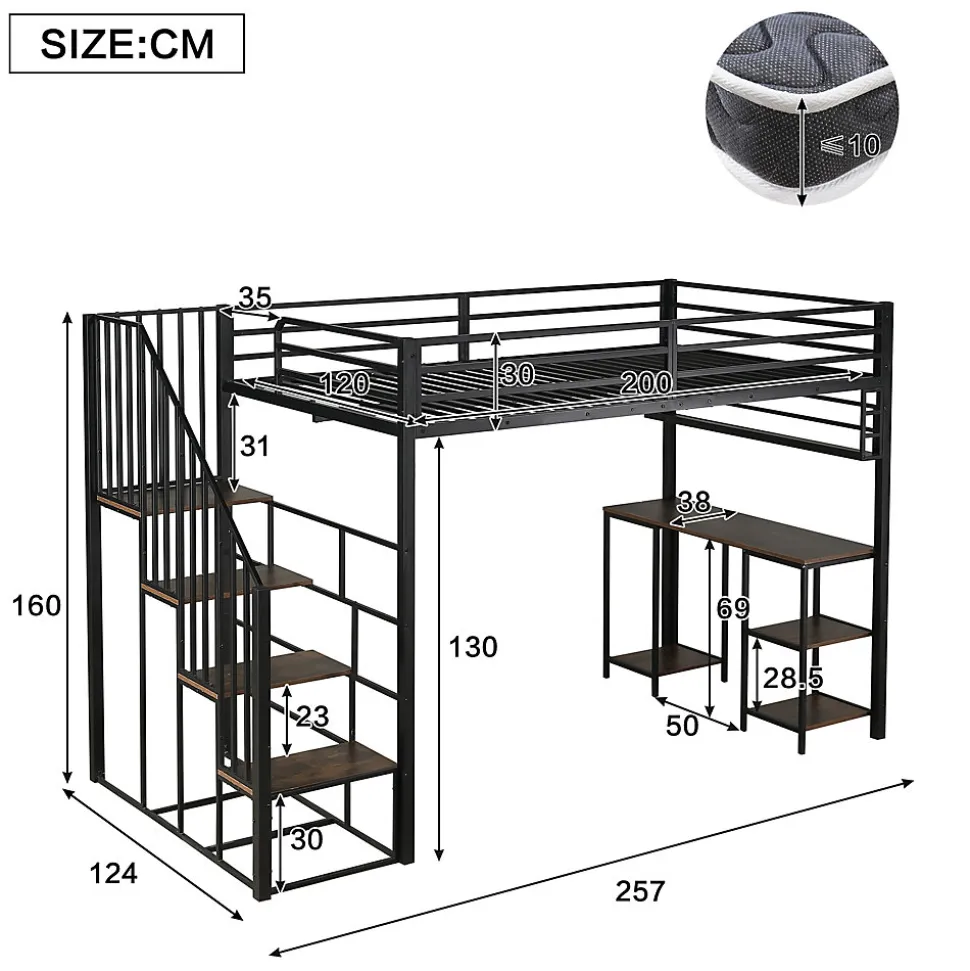 •【Avec bureau intégré】Ce lit mezzanine en fer forgé est doté d’un bureau intégré pratique, idéal pour les devoirs ou les activités créatives sans occuper d’espace supplémentaire.•【Escalier avec rampes pour un accès sécurisé】Ce lit mezzanine est équipé d’un escalier avec rampes qui s’adapte à la taille de l’enfant, permettant ainsi aux plus jeunes d’y accéder et d’en sortir facilement et en toute sécurité.•【Avec étagères de rangement】Outre le bureau, ce meuble dispose également d’étagères de rangement, idéales pour ranger livres, jouets ou fournitures scolaires, pour une chambre d’enfant bien rangée.•【Robuste】Le sommier à lattes robuste assure un soutien stable, une grande durabilité et un environnement de sommeil sûr.•【Taille classique】Ce lit mezzanine est disponible dans des dimensions classiques de 120 x 200 cm, offrant un grand espace de couchage et s’adaptant parfaitement aux dimensions typiques d’une chambre d’enfant.•【Facile à assembler】Des instructions détaillées et des pièces complètes sont disponibles pour vous aider à réaliser l’assemblage rapidement.