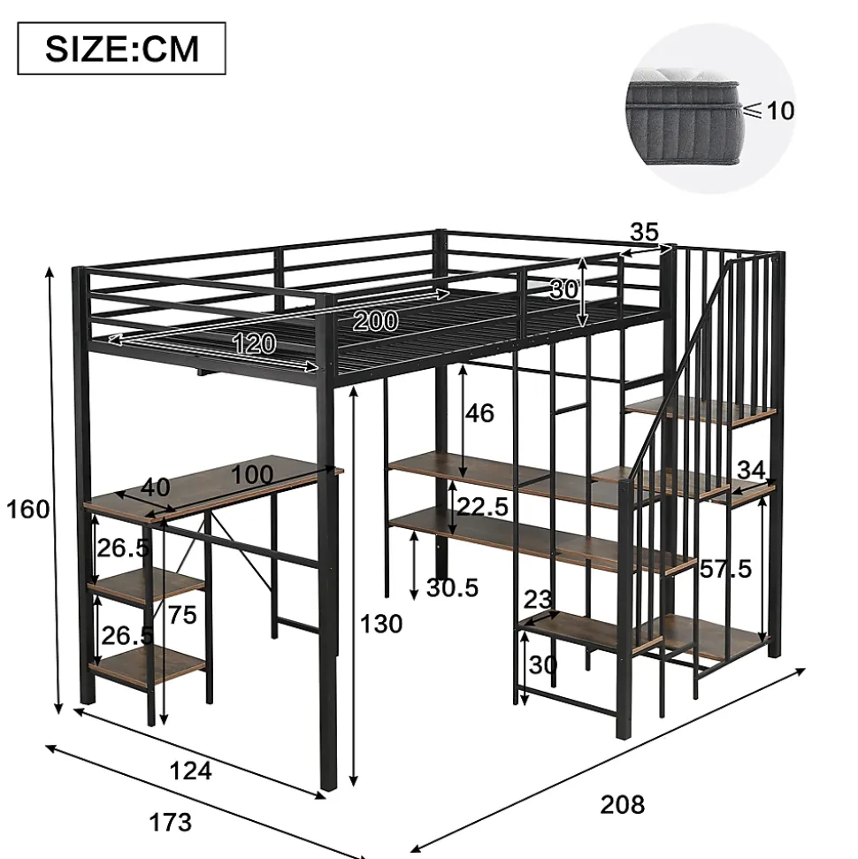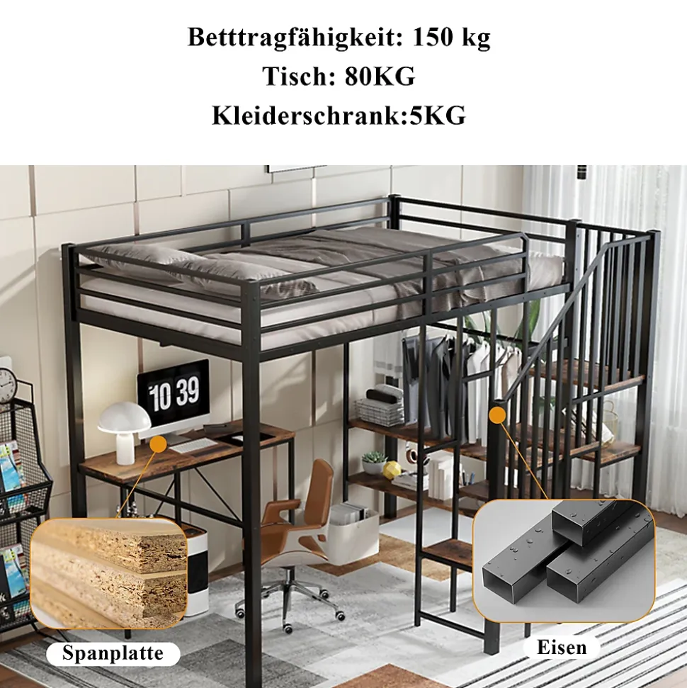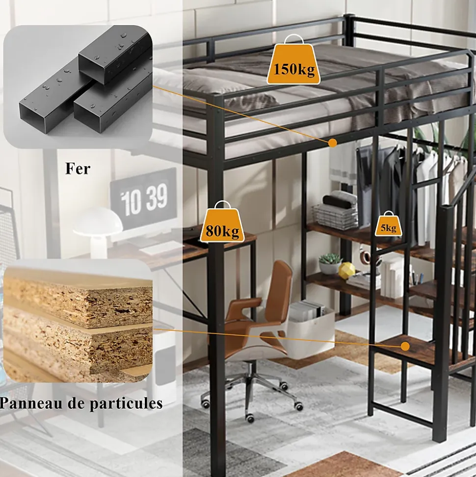 ▶ ▶ Détails ▶────────────────● Nom du produit : Lit mezzanine● Dimensions totales : 208 x 173 x 160 cm● Couleur : Noir● Matériau du cadre : Fer, Métal● Matériau des lattes : Fer, Métal● Montage requis : Oui, installation par soi-même● Structure interchangeable de gauche à droite : Non● Poids total : 75,5 kg● Distance du lit au sol : 130 cm● Dimensions des matelas compatibles : 120 x 200 cm (épaisseur maximale du matelas ≤ 10 cm)● Capacité de poids du lit : 150 kg● Capacité de poids de la table : 80 kg● Nombre de colis : 3► Remarques ►※ En raison de la mesure manuelle, une différence de 2 à 3 cm peut se produire.※ Les images du produit sont prises avec le produit réel, mais des variations de couleur peuvent apparaître en raison de la lumière et d’autres facteurs.※ Ce produit sera expédié en 3 colis, qui peuvent ne pas arriver simultanément. Veuillez patienter.※ Si vous avez des questions pendant l’installation, veuillez nous contacter dès que possible.