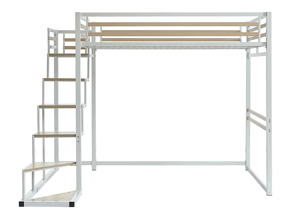 Le lit mezzanine JOGUI est le lit parfait pour aménager un studio ou une chambre d’adolescent. Avec son couchage 2 personnes, sa structure en métal et ses couleurs aux tons modernes, ce lit trouvera facilement sa place dans votre intérieur tout en vous garantissant la solidité dont vous avez besoin. Ce lit est également équipé de réelles marches pour vous permettre de monter dans la mezzanine en toute sécurité. Son petit plus : Utilisez l’espace disponible sous la mezzanine pour y placer un canapé, un bureau ou un meuble de rangements pour une réelle optimisation de l’espace !Caractéristiques Couleur (nuance) : Blanc Matière (précision) : Métal Finition : Mat Taille (couchage) : 140 x 200 cm Nombre de places : 2 places Réversible Option (meuble) : Avec escalier Sans matelas Avec sommier Type de sommier : Cadre à lattes Nombre de lattes : 52 lattes Charge maximale supportée : 240 kg À monter soi-même : Marches et barrière en MDF mélaminé : L’échelle peut être montée vers la gauche ou vers la droite : Ce lit est compatible avec tous les matelas 140×200 cm : Attention, le lit ne convient pas aux enfants de moins de 6 ansDimensions Longueur : 260.5 cm Hauteur : 197 cm Profondeur : 198 cm Hauteur de couchage : 175 cm Hauteur sous la mezzanine : 165 cm Hauteur de la barrière de sécurité : 32 cmLivraisonLors de la livraison, il est conseillé de vérifier que le bon nombre de colis a été livré.ColisColis n°1 : Longueur 213 cm, Largeur 54 cm, Hauteur 14 cm, Poids 53 kg. Colis n°2 : Longueur 153 cm, Largeur 58 cm, Hauteur 13 cm, Poids 38 kg. Colis n°3 : Longueur 65 cm, Largeur 54 cm, Hauteur 7 cm, Poids 9 kg.